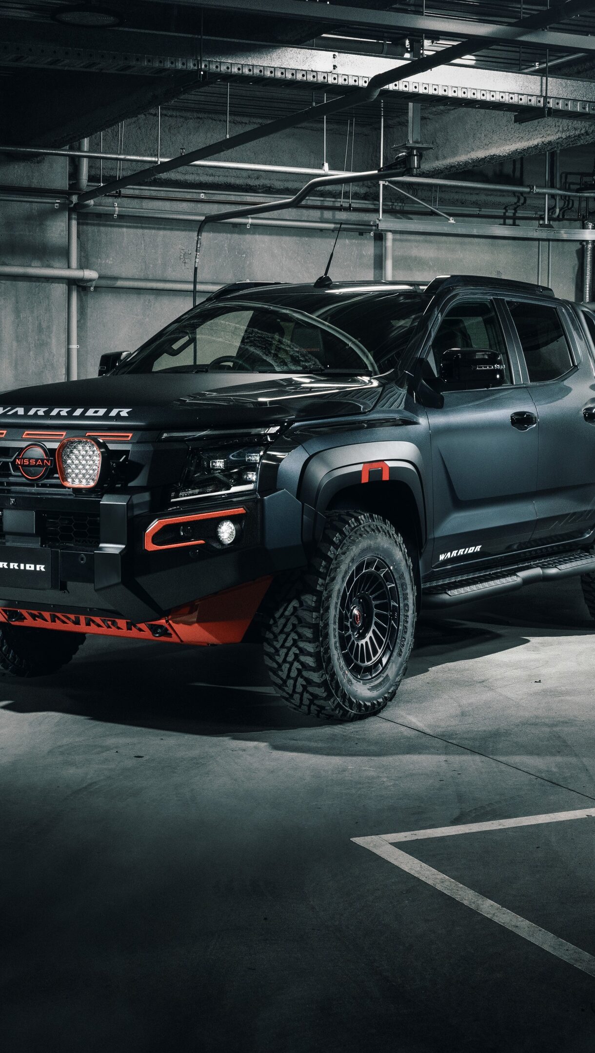 An imposing 4K wallpaper presenting a matte black Nissan Navara Warrior pickup truck, parked dramatically under moody lighting in an industrial-style studio. Its powerful stance is accentuated by bright orange accents and prominent LED lights, cutting through a subtle atmospheric haze to convey a sense of raw capability and style.