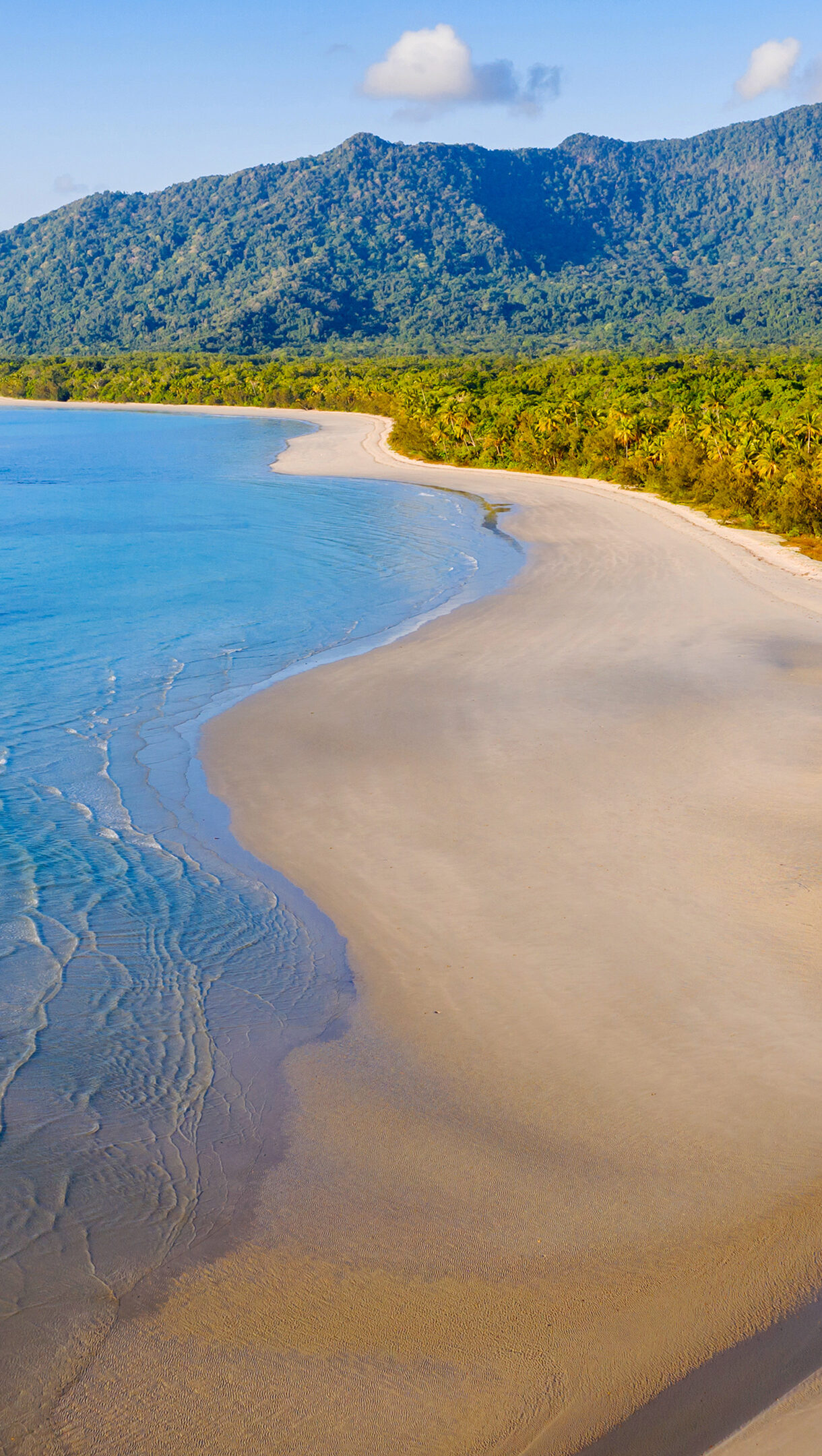 A breathtaking 4K wallpaper showcasing Noah Beach, where the ancient Daintree Rainforest dramatically meets the expansive, calm ocean from an aerial perspective. The pristine golden sand, intricate patterns of the shallow waves, and a meandering river estuary perfectly illustrate the harmonious blend of vibrant ecosystems.