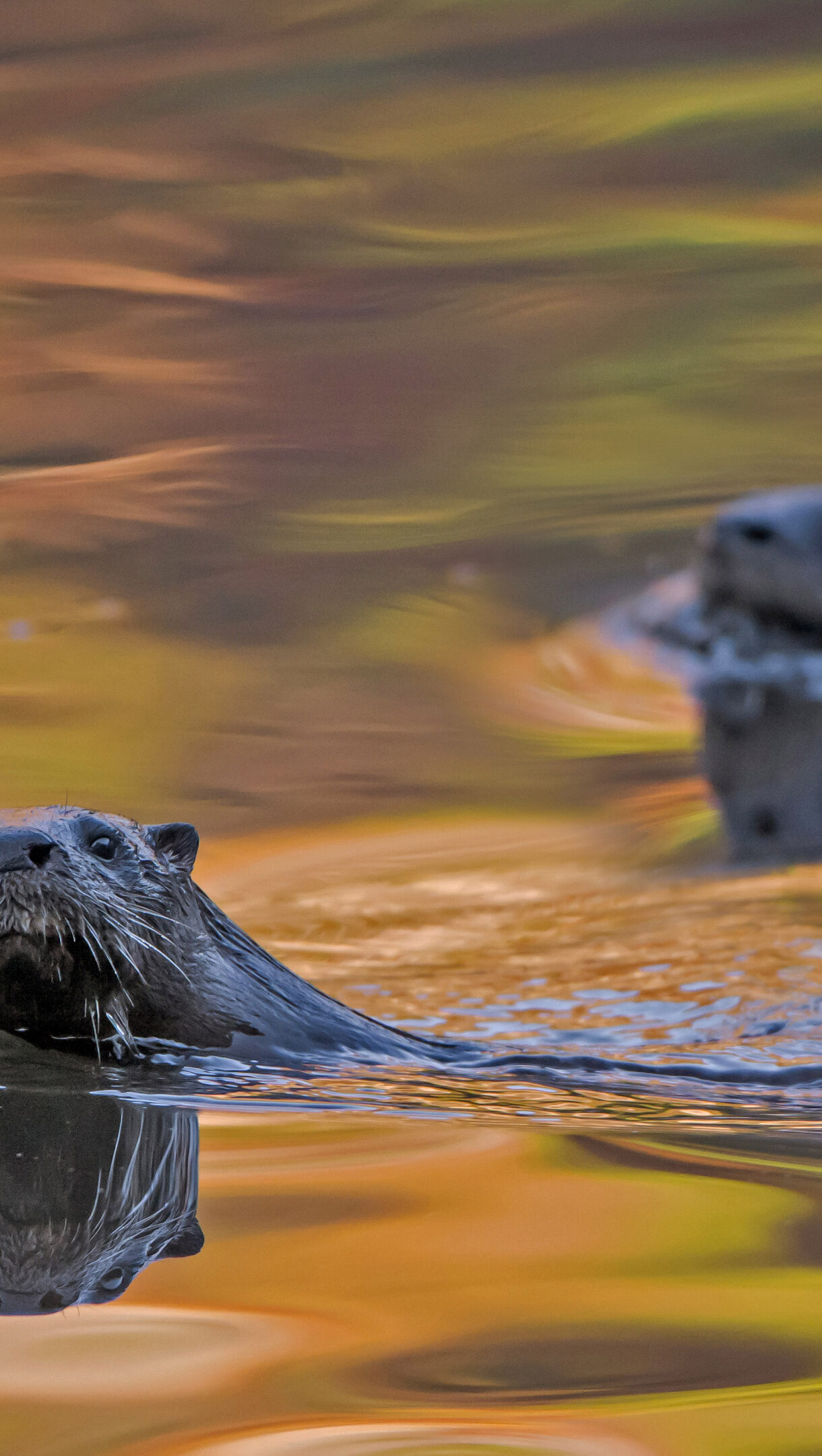An enchanting 4K wallpaper features two North American River Otters gracefully swimming in the reflective waters of Acadia National Park, Maine. The lead otter's head breaks the surface with a curious gaze, while the water around them shimmers with warm, painterly reflections of autumn foliage in shades of gold and amber.