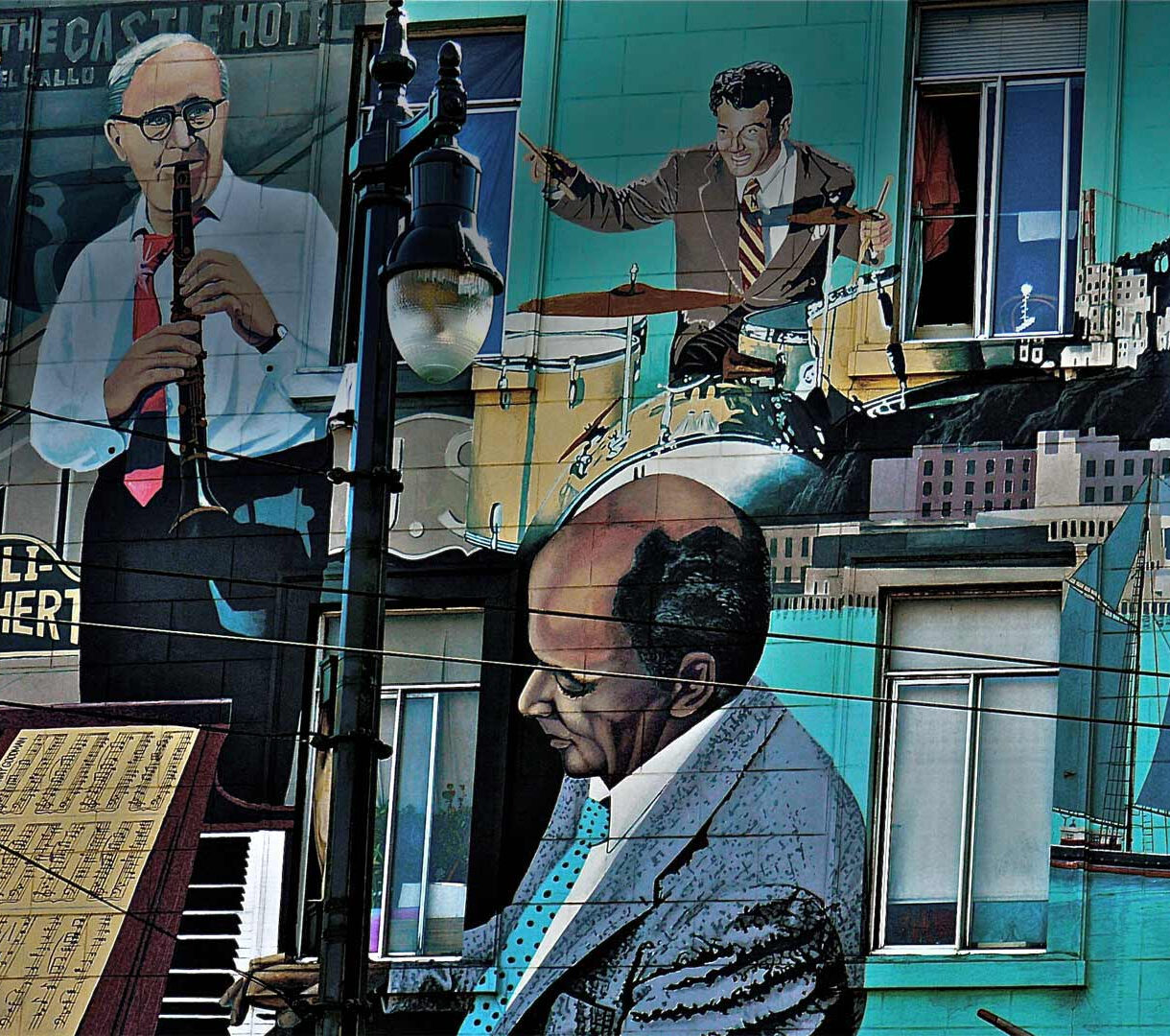A captivating 4K wallpaper illustrating Bill Weber’s North Beach Jazz Mural, featuring lively jazz musicians painted across a vibrant San Francisco cityscape building facade. The mural cleverly integrates actual building elements like windows and a lamp post with painted San Francisco landmarks, including Coit Tower and sailboats under a moon, creating a rich, musical urban narrative through vibrant blues and teals.