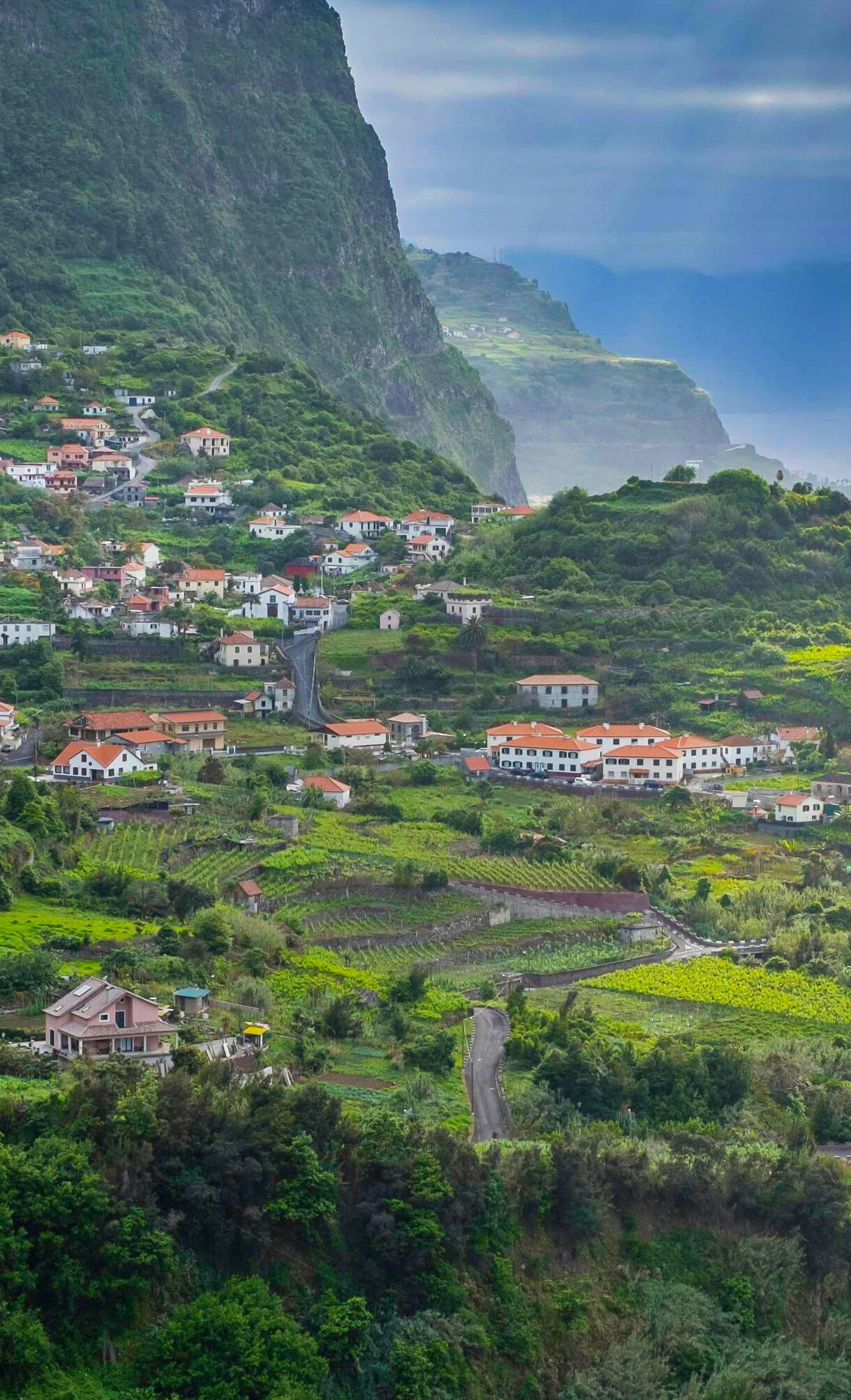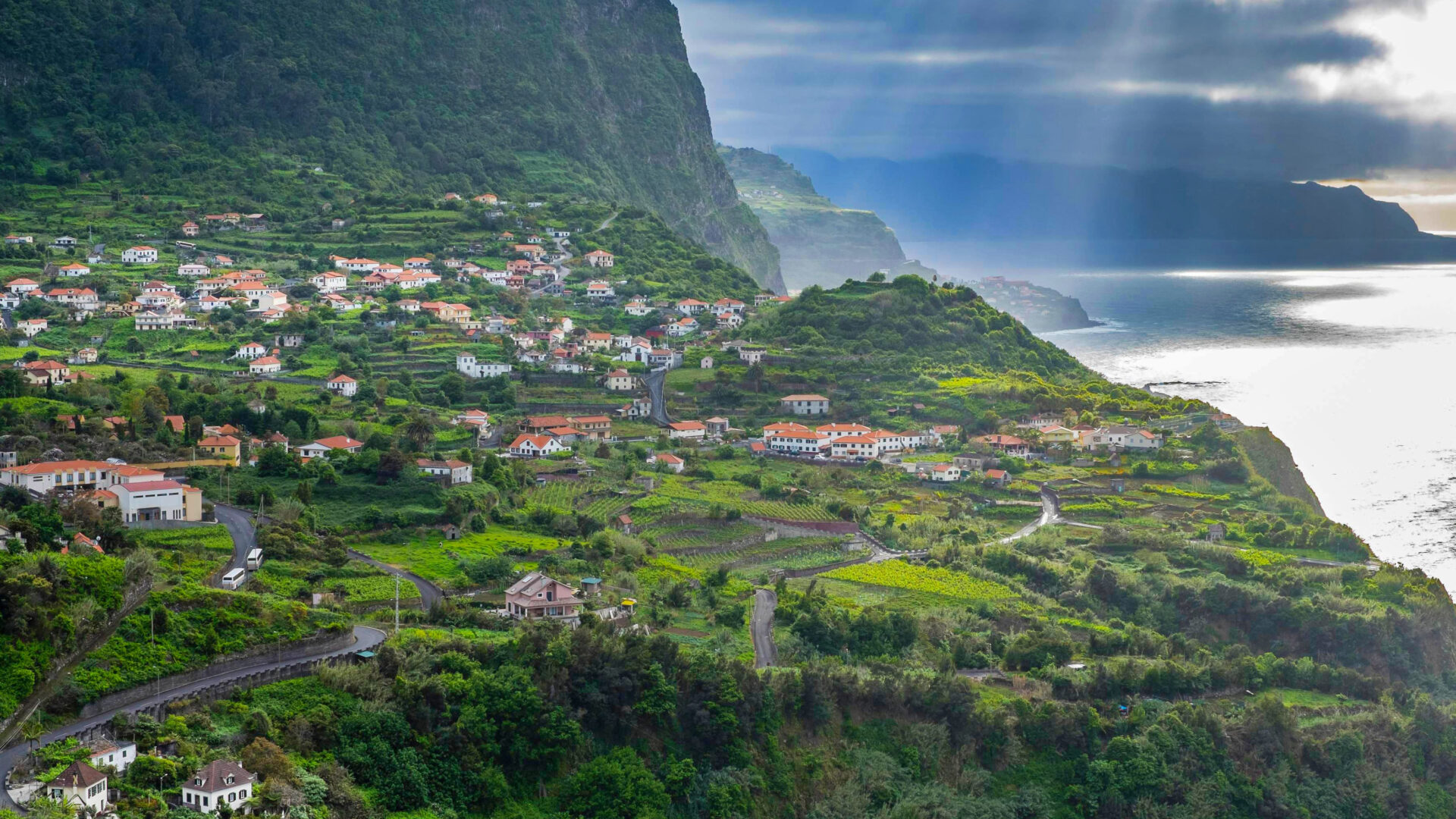 A majestic 4K wallpaper showcases a vibrant village built into the dramatically steep, terraced green hillsides of Madeira, Portugal’s North Coast. Sunlight dramatically breaks through heavy clouds to illuminate a shimmering path on the dark ocean waters, contrasting beautifully with the rich, deep green of the surrounding landscape.