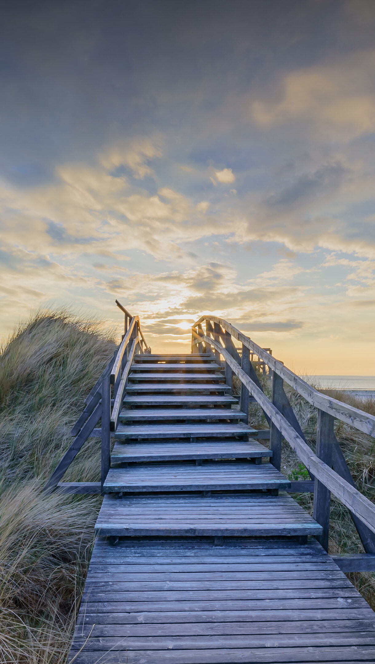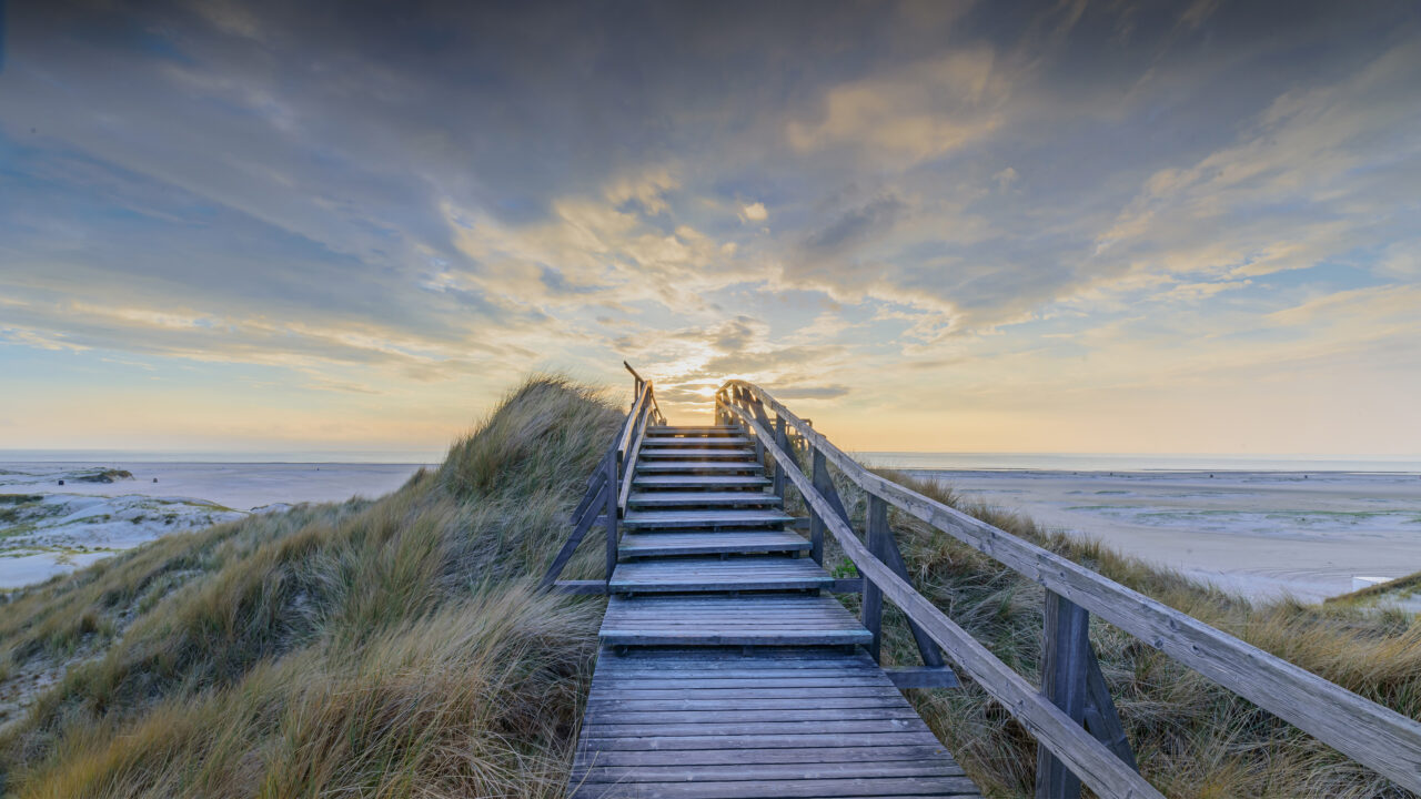 A majestic 4K wallpaper of a weathered wooden boardwalk ascending over grassy dunes toward a North Sea sunset on Norddorf, Amrum Island, Germany. The soft golden light of the setting sun illuminates the horizon and casts a tranquil glow across the vast, sandy beach and the beautifully scattered clouds above.