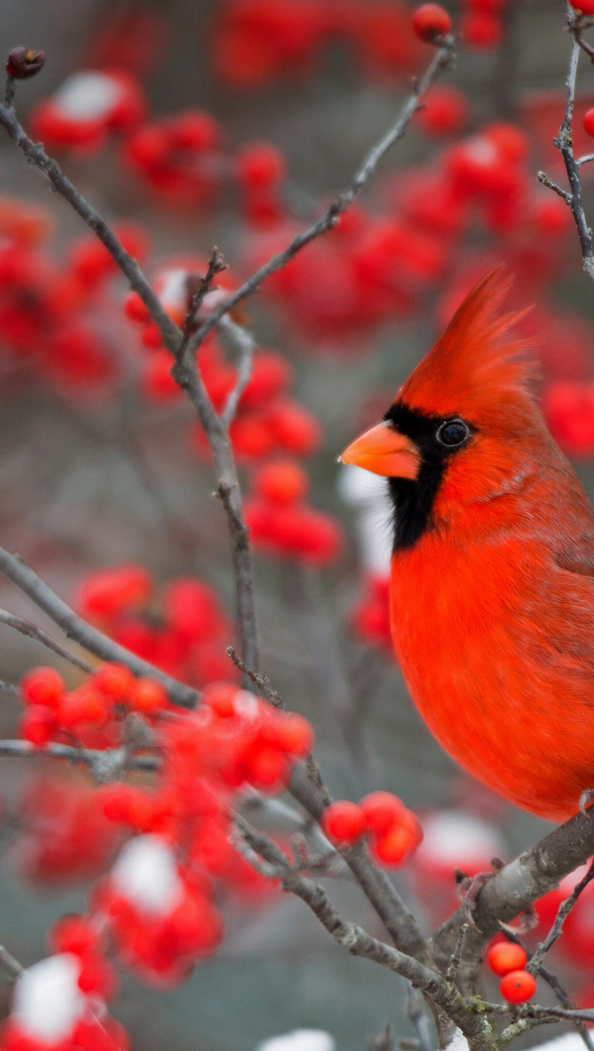 A brilliant 4K wallpaper showcasing a vibrant male Northern Cardinal perched amidst a snow-dusted Winterberry bush. The bird's vivid red plumage creates a stunning contrast with the abundant, equally bright red berries and the soft, cool tones of the snowy background, evoking a cheerful winter scene.