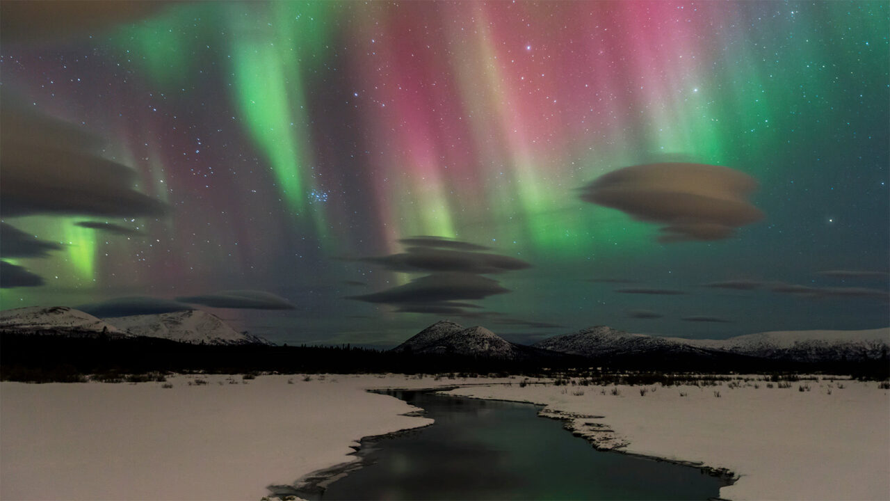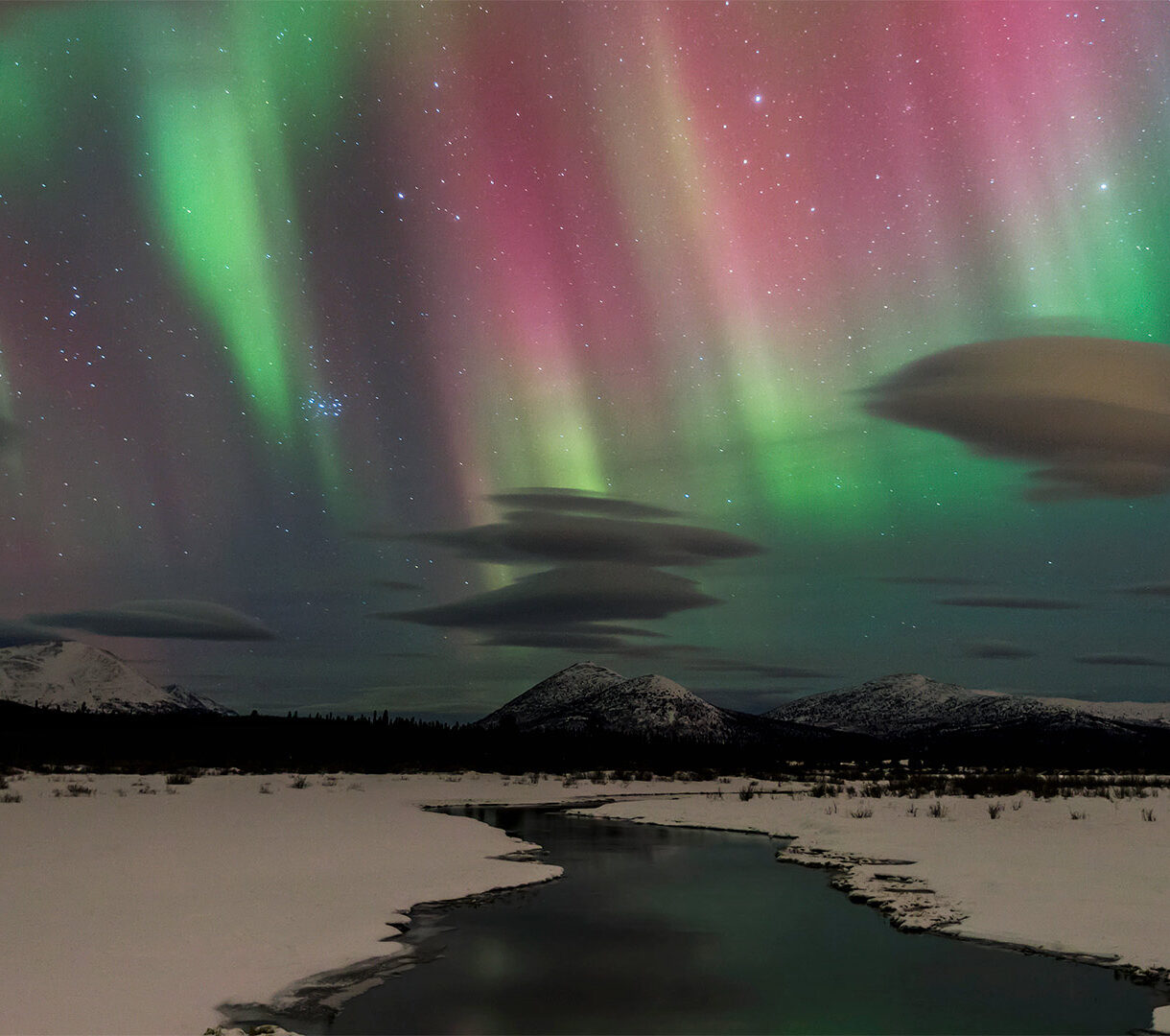 A majestic 4K wallpaper showcasing the Northern Lights Aurora Borealis illuminating a vast winter landscape over a winding river in Yukon, Canada, with snow-capped mountains in the distance. Ribbons of vibrant green and pink light streak across the starlit sky, casting a reflective glow on the partially frozen river and creating a breathtaking, tranquil mood.