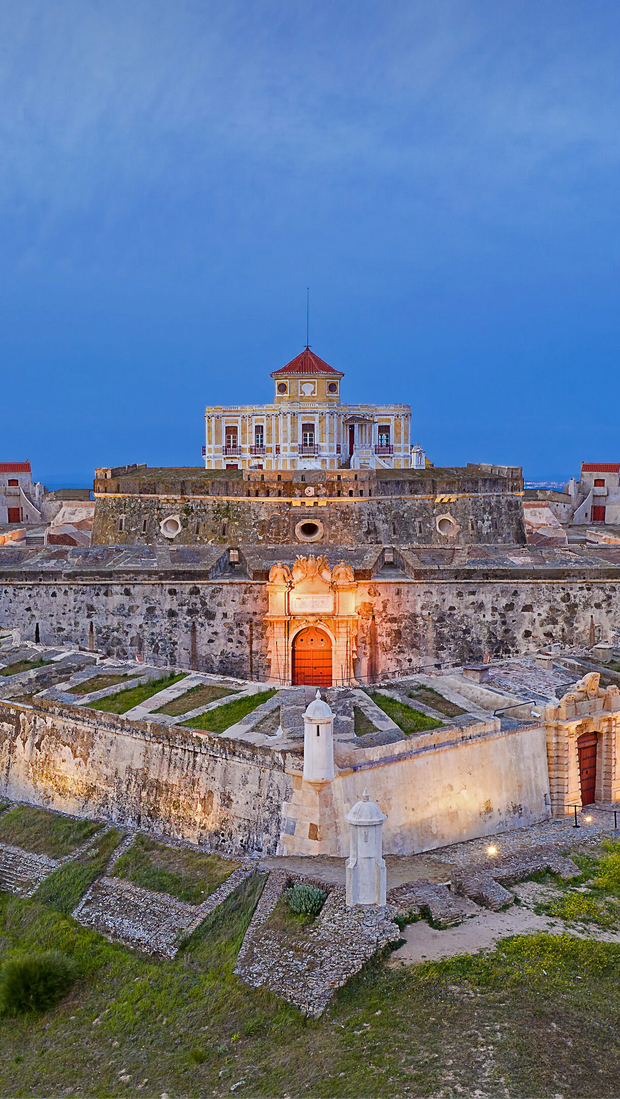 A captivating 4K wallpaper showcases the grand Nossa Senhora da Graça Fort in Elvas, Portugal, a sprawling military fortification atop a hill under a twilight sky. Warm interior lights and strategic exterior illuminations cast a golden glow on the fort's ancient stone walls, contrasting dramatically with the deep, inky blue of the dusk sky above.