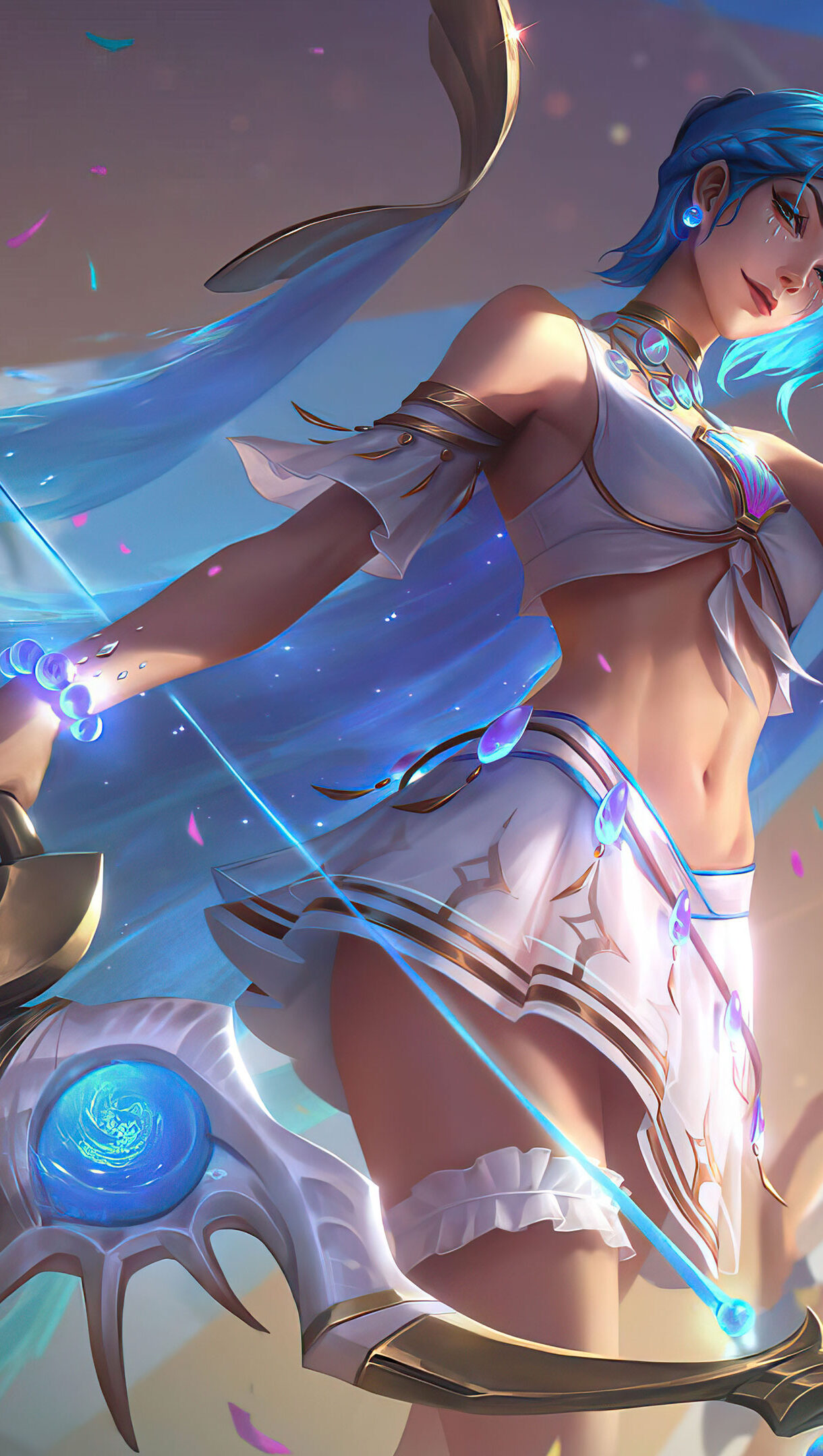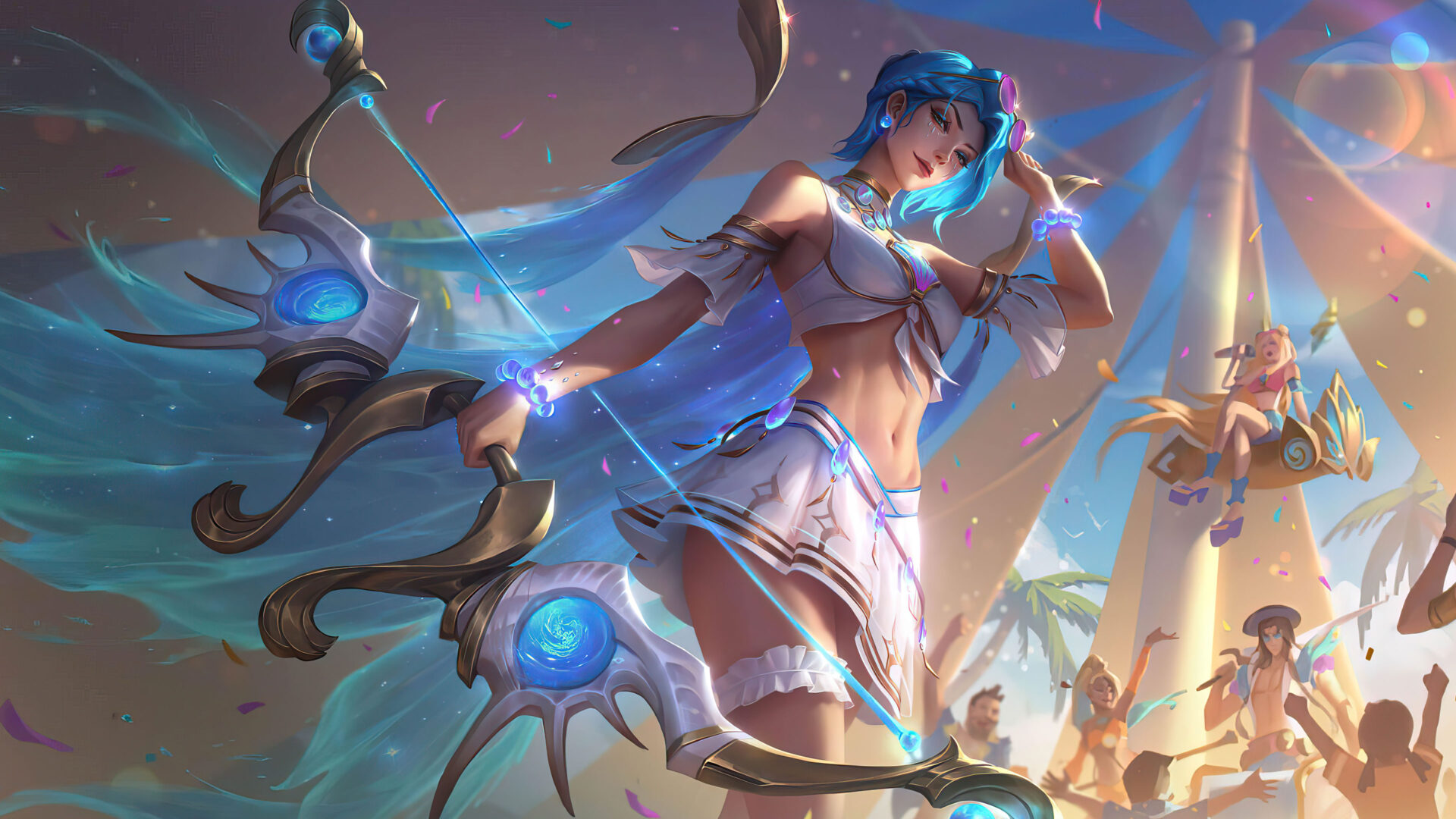 A stunning 4K wallpaper featuring the Ocean Song Ashe Pearl Chroma skin from League of Legends. Ashe, the Frost Archer, is depicted in a serene oceanic theme with her Pearl Chroma, showcasing her elegance and poise amid a tranquil underwater backdrop.