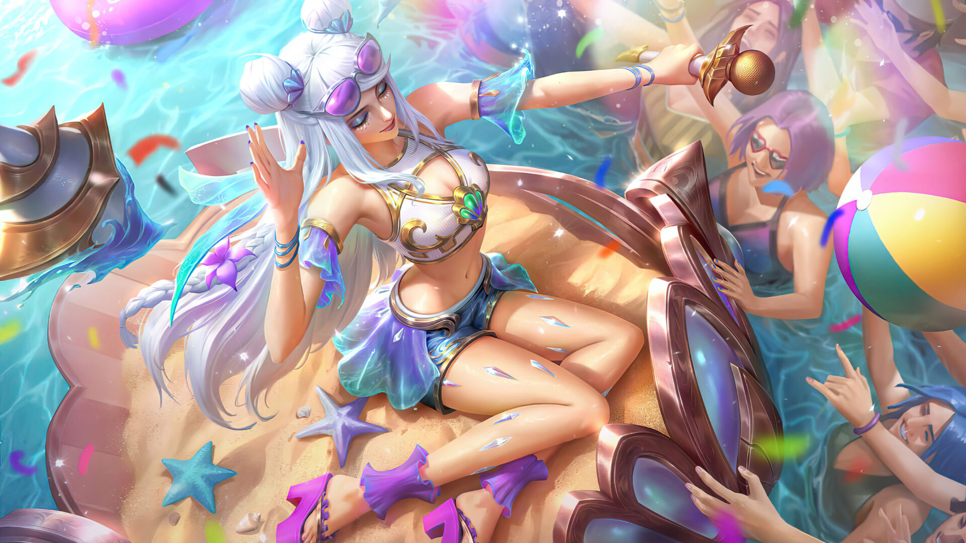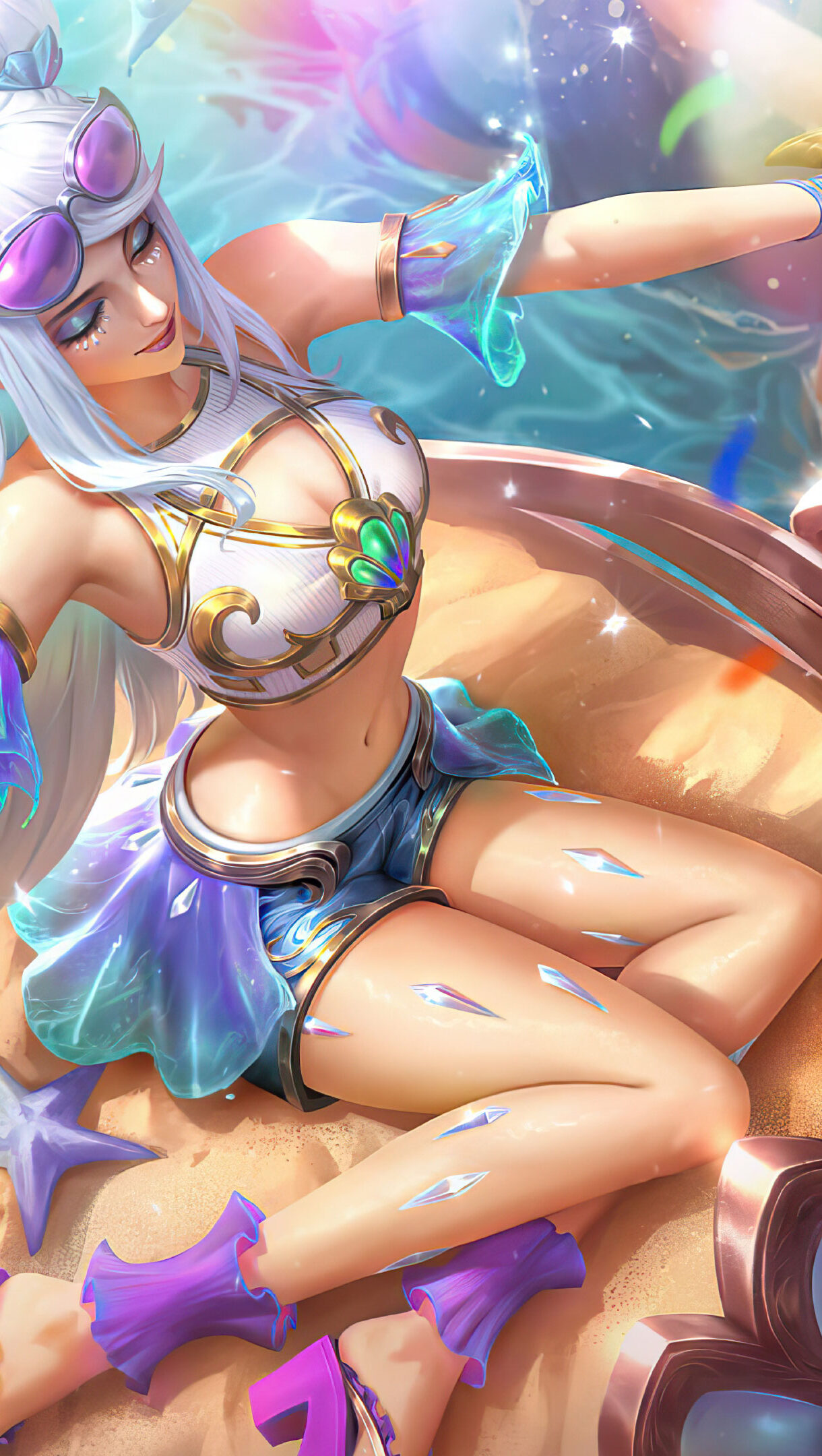 A stunning 4K wallpaper featuring the Ocean Song Seraphine Pearl Chroma skin from League of Legends. Seraphine, the Starry-Eyed Songstress, is depicted in a serene oceanic setting, adorned in her Pearl Chroma skin that shimmers with aquatic elegance and a tranquil, magical aura.