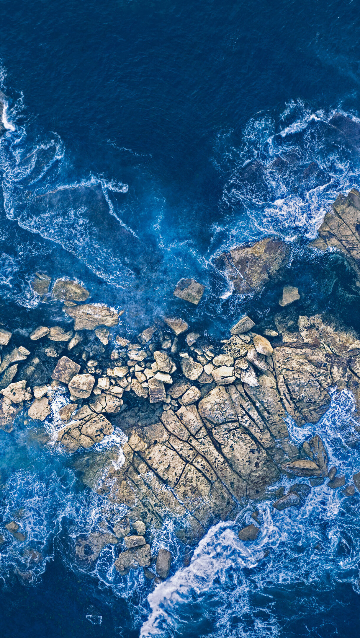 An immersive 4K wallpaper portrays ocean waves vigorously crashing over a distinctive heart-shaped rock island. The vivid white foam of the powerful waves contrasts dramatically with the deep, mysterious blue of the surrounding sea and the textured, rugged rock formations.