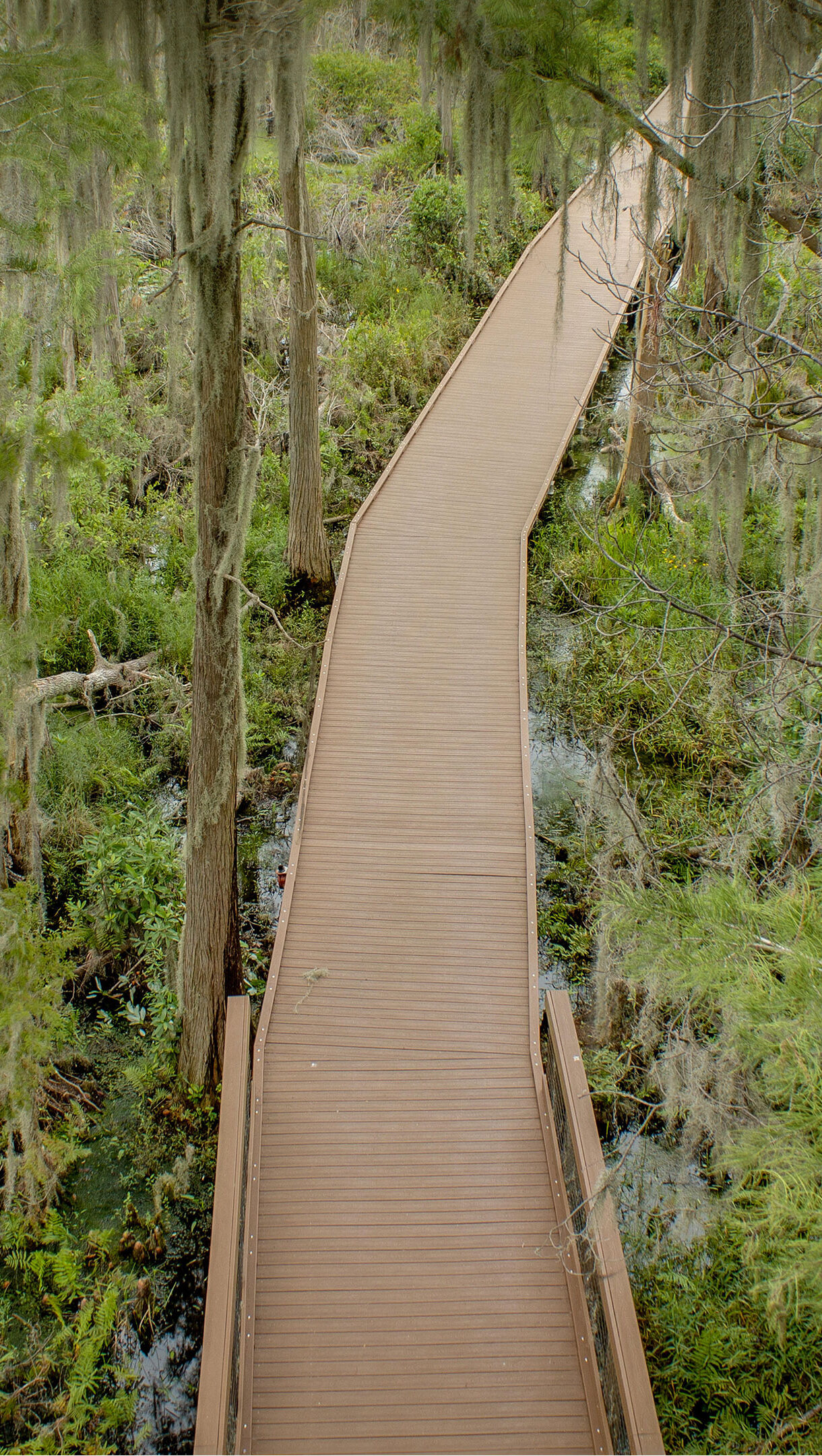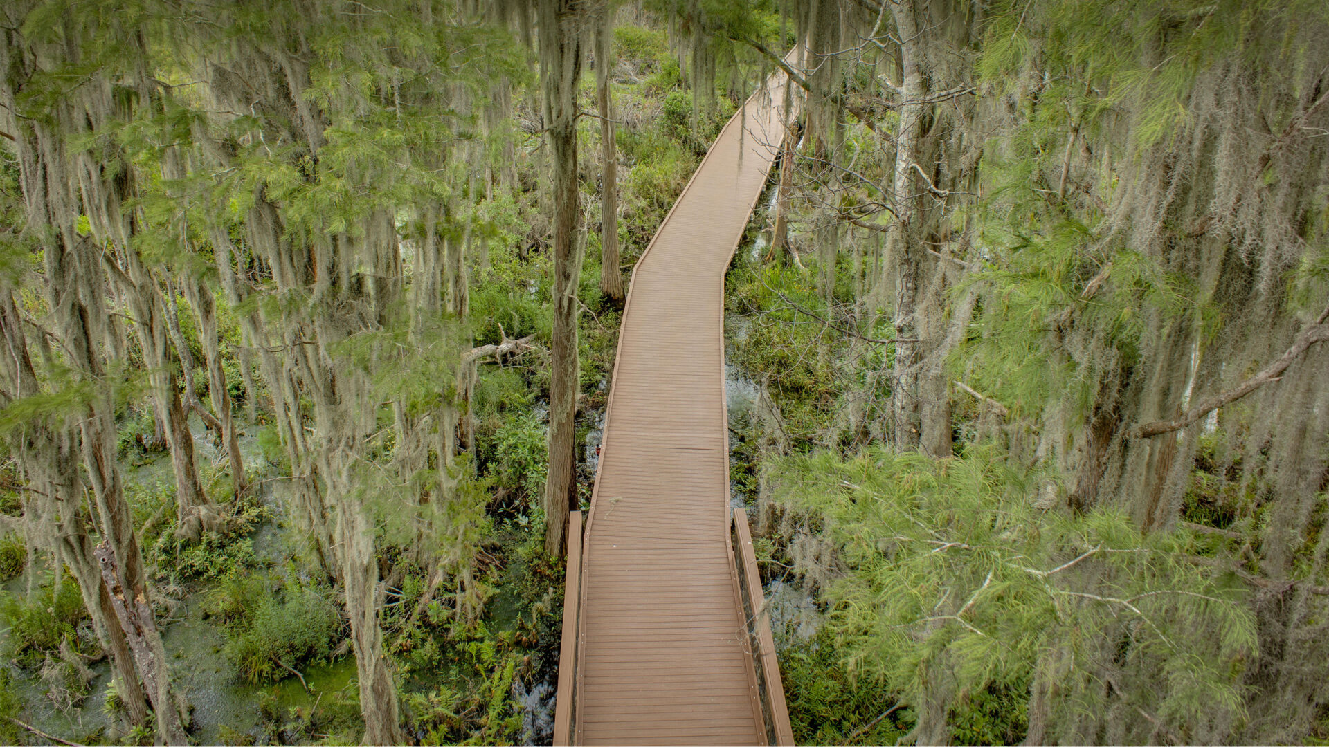 An atmospheric 4K wallpaper featuring a winding wooden boardwalk extending through the dense, lush Okefenokee Swamp. Abundant Spanish moss hangs ethereally from tall trees, creating a captivating interplay of greens and grays that evokes a mystical, ancient natural environment.