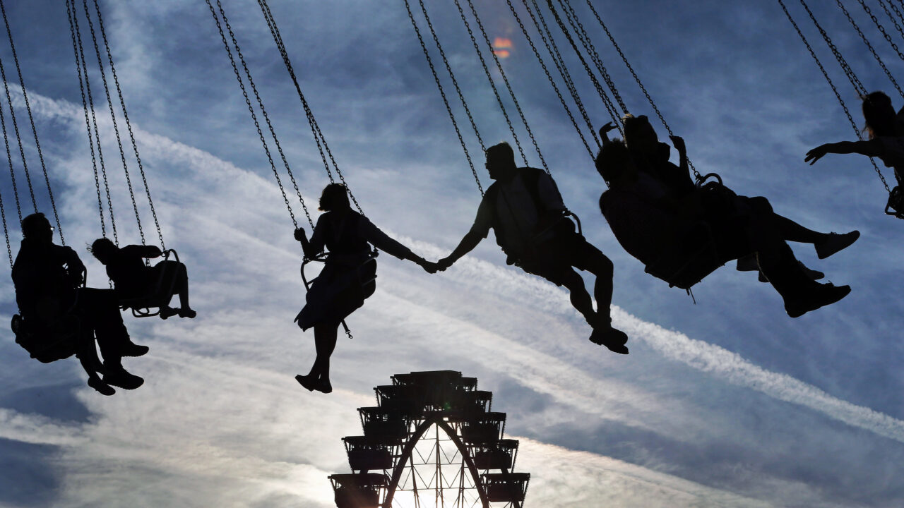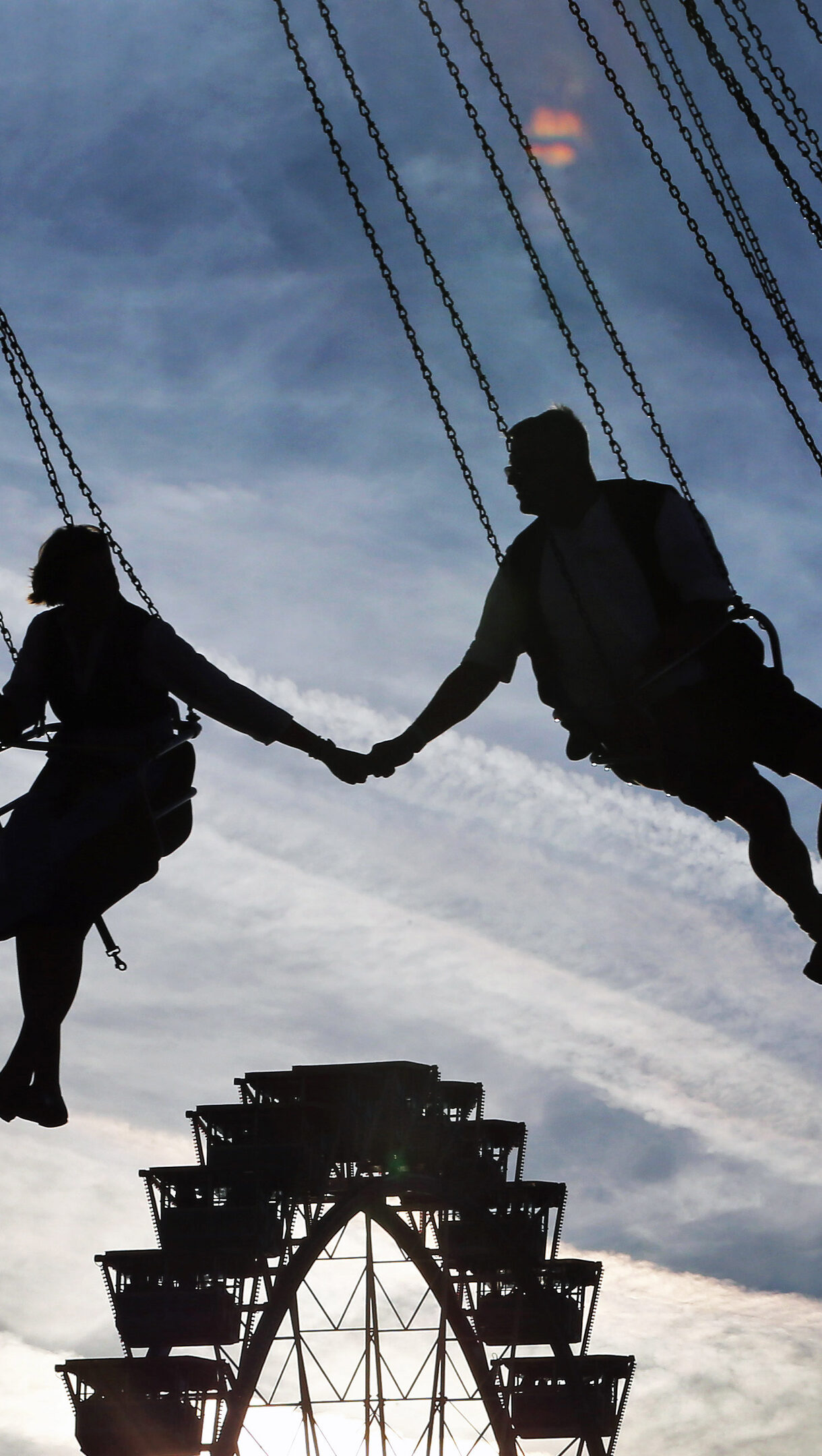 A dynamic 4K wallpaper featuring silhouettes of revelers on a chain swing ride high above the Oktoberfest fairgrounds in Munich. The stark silhouettes emphasize their swinging movement and the joyful interaction of a couple holding hands, all against the dramatic, streaked twilight sky.