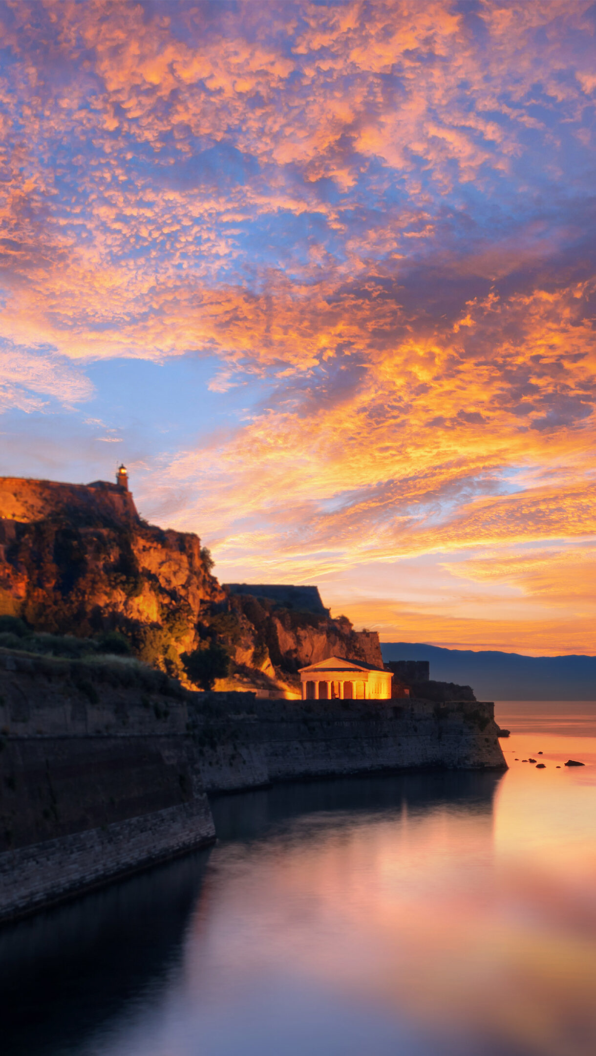 A breathtaking 4K wallpaper features the Old Fortress of Corfu in Greece standing majestically by the sea, silhouetted against a dramatic sunset sky. Fiery orange and deep purple clouds fill the vast sky, reflecting intensely on the calm water where two sailboats float, creating a truly spectacular and serene scene.
