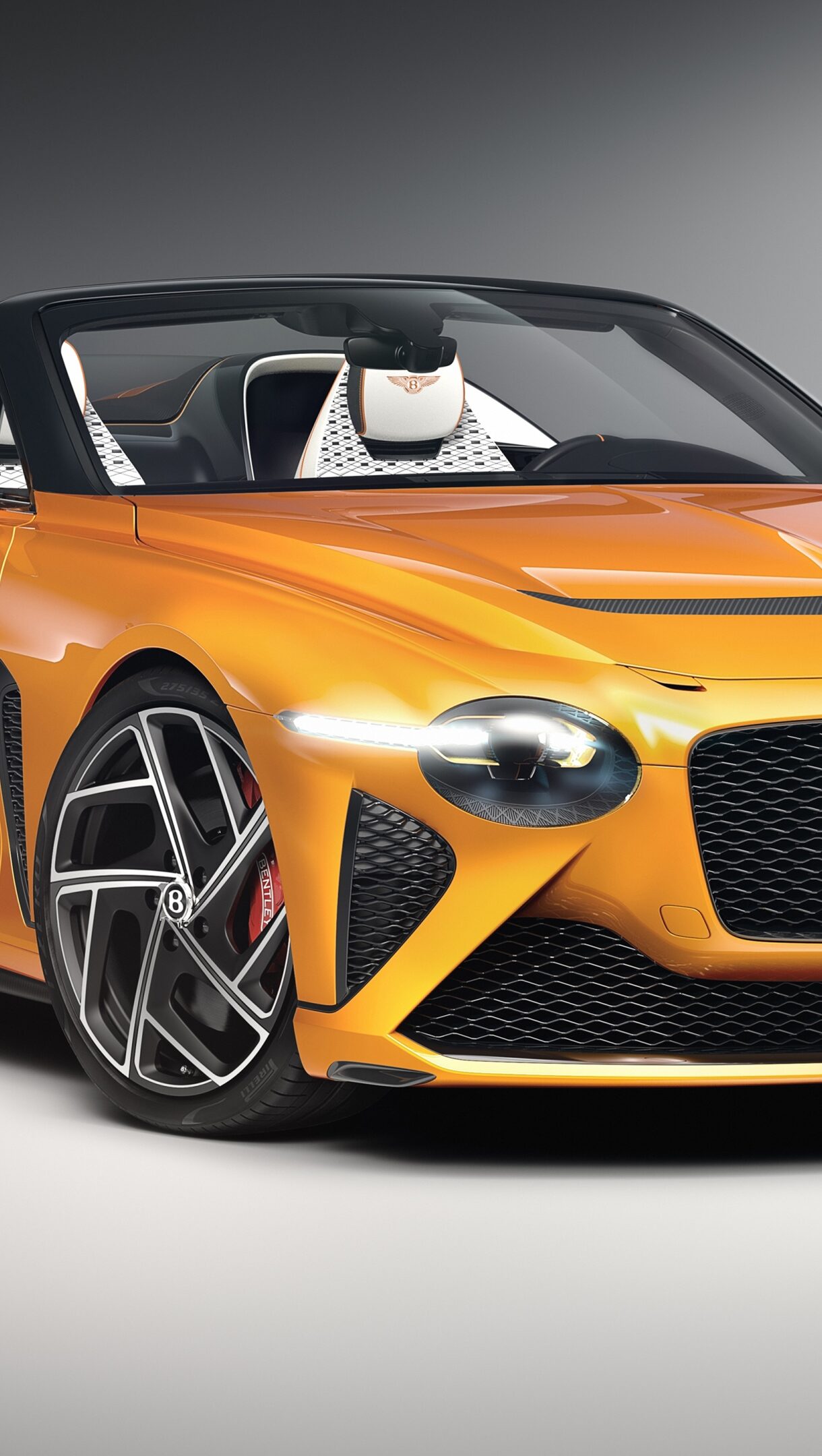 An exquisite 4K wallpaper showcasing an Orange Bentley Mulliner Bacalar Convertible, elegantly displayed in a pristine studio setting. Its vibrant orange body glows under soft lighting, highlighting the luxurious interior with unique white and black patterns, and the intricate details of its imposing front grille and wheels.