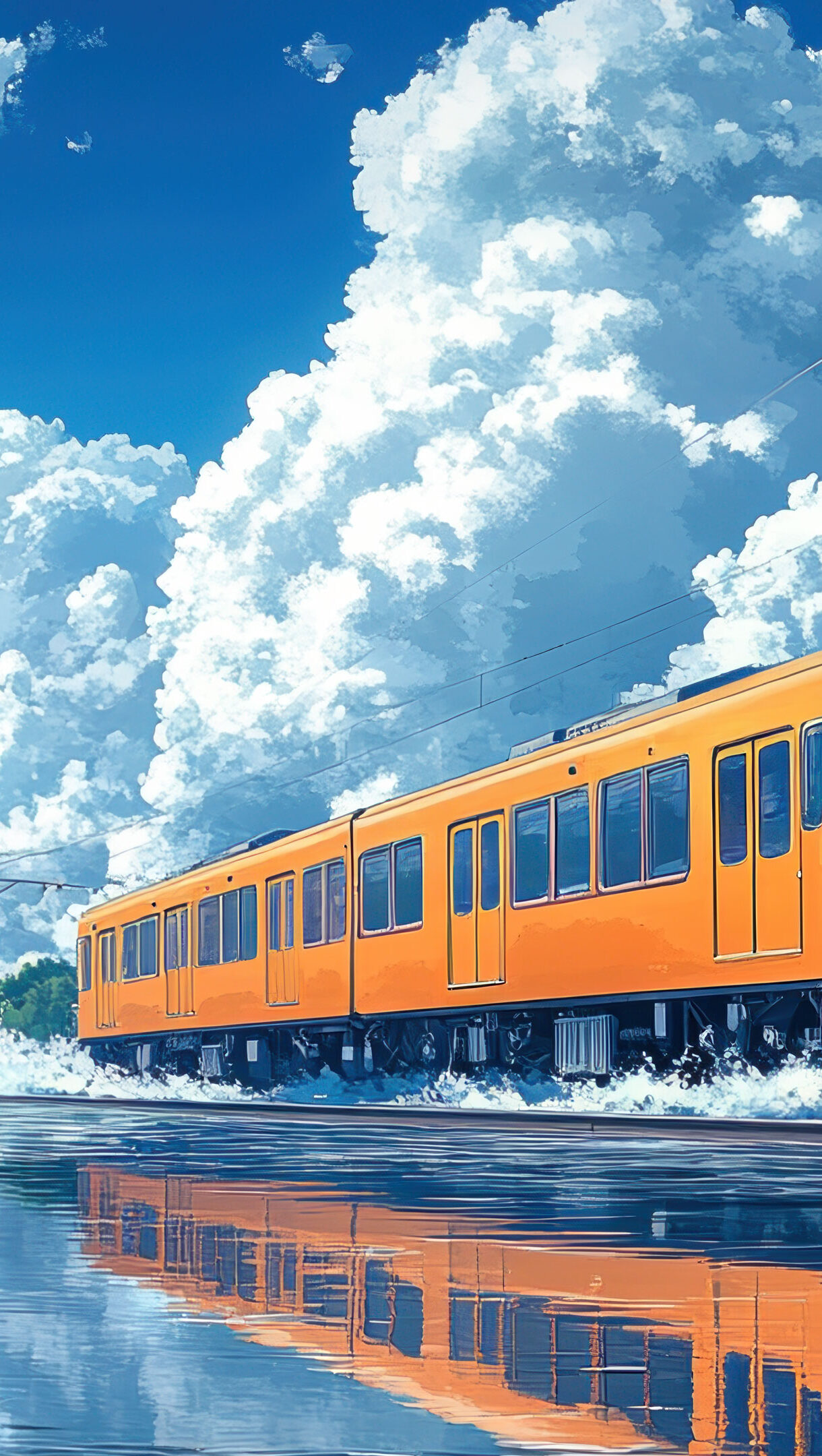 A surreal 4K wallpaper depicting an orange train gliding over water, creating a mesmerizing reflection on the calm surface. The dreamy and futuristic setting blends realism with fantasy, making for a visually stunning and unique background. Simply click the download button to bring this masterpiece to life on your screen as a desktop wallpaper or save it for later in your picture collection.