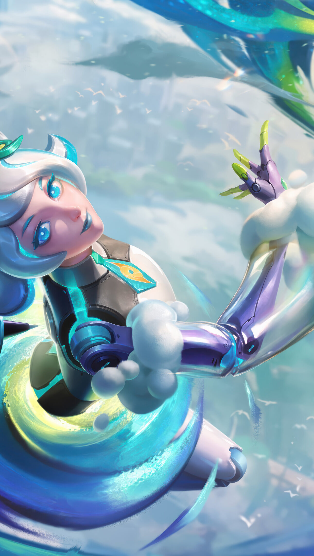 A vibrant 4K wallpaper showcasing Orianna, the Weather Entity, a serene automaton with light blue hair and eyes, gracefully floating amidst a fantastical sky realm of swirling winds and abstract meteorological structures. Her iridescent metallic body, adorned with soft clouds, reflects an exquisite blend of blues, purples, and greens, evoking a dynamic and magical control over the elements.