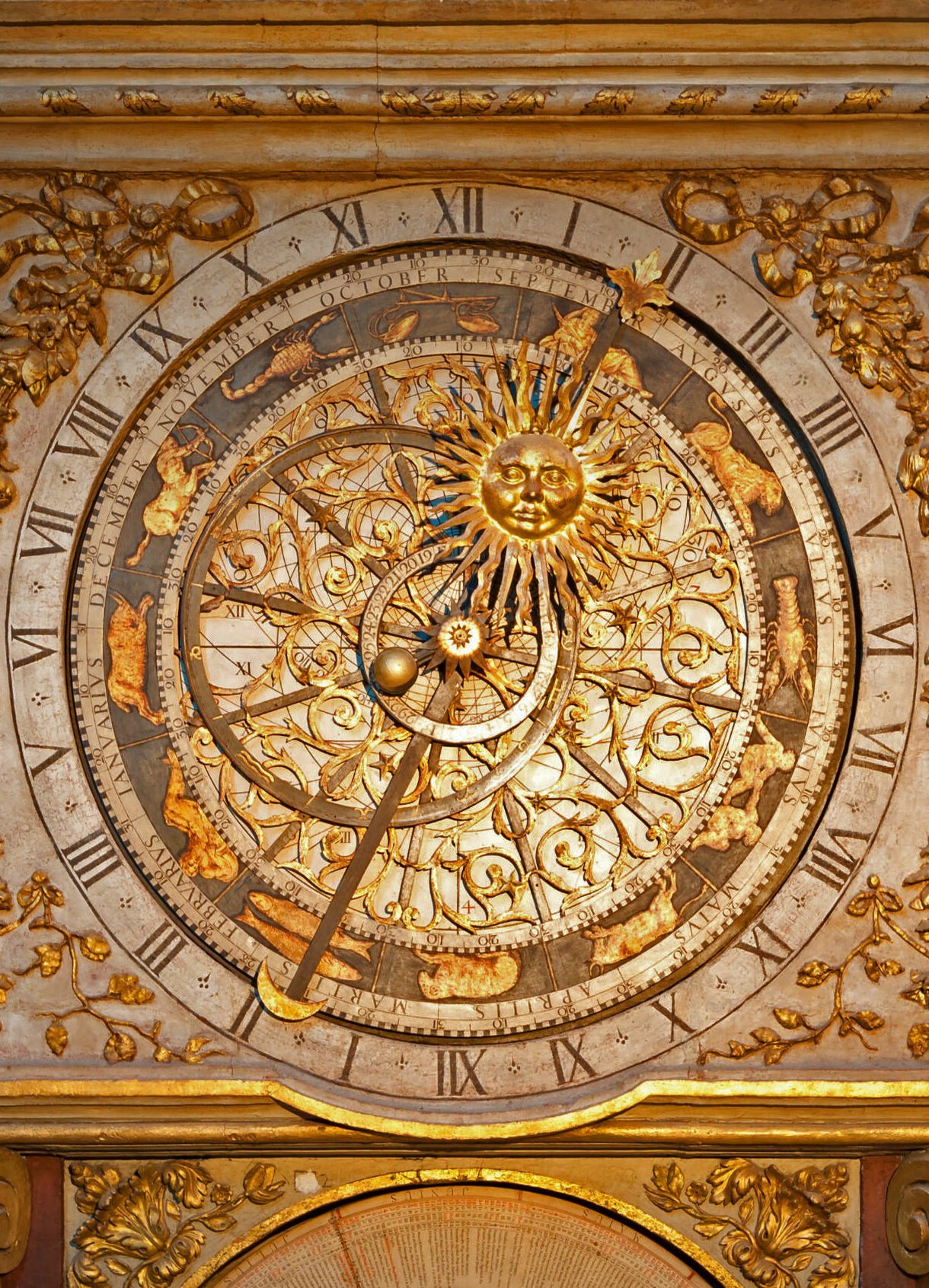 A majestic 4K wallpaper showcasing an ornate golden astronomical clock in Lyon, France, set against a dimly lit, grand stone interior. Its richly detailed golden mechanisms, including Zodiac Signs and a radiant sun, brilliantly illuminate the somber, ancient stone architecture with a warm, captivating glow.