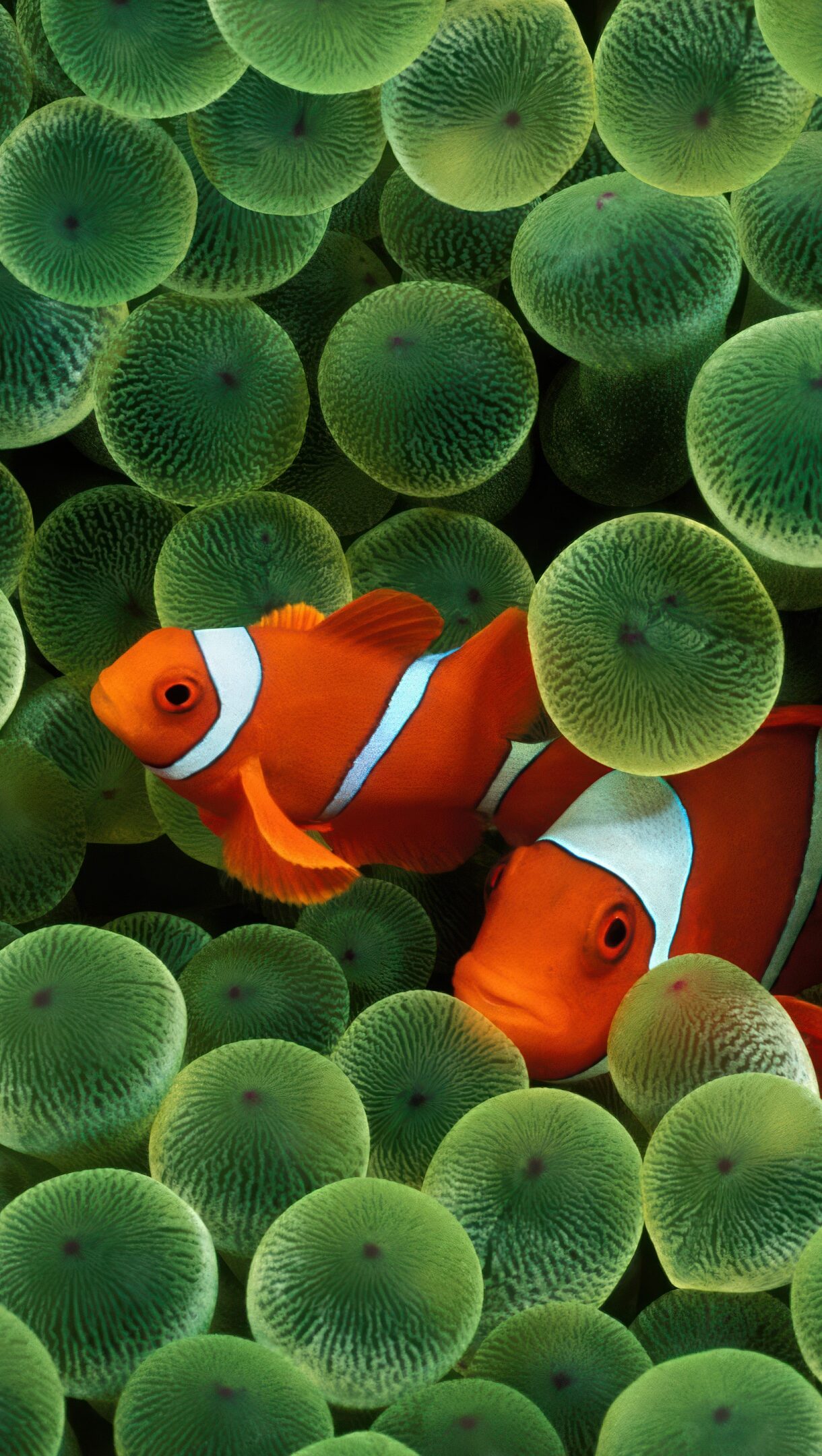A vibrant 4K wallpaper showcases two iconic orange and white clownfish nestled deeply within the lush, bulbous green tentacles of their host anemone, famously associated with OS X Leopard. The vivid contrast of the fish’s brilliant orange and crisp white stripes against the anemone's glowing, textured green bulbs creates a mesmerizing and serene underwater scene.