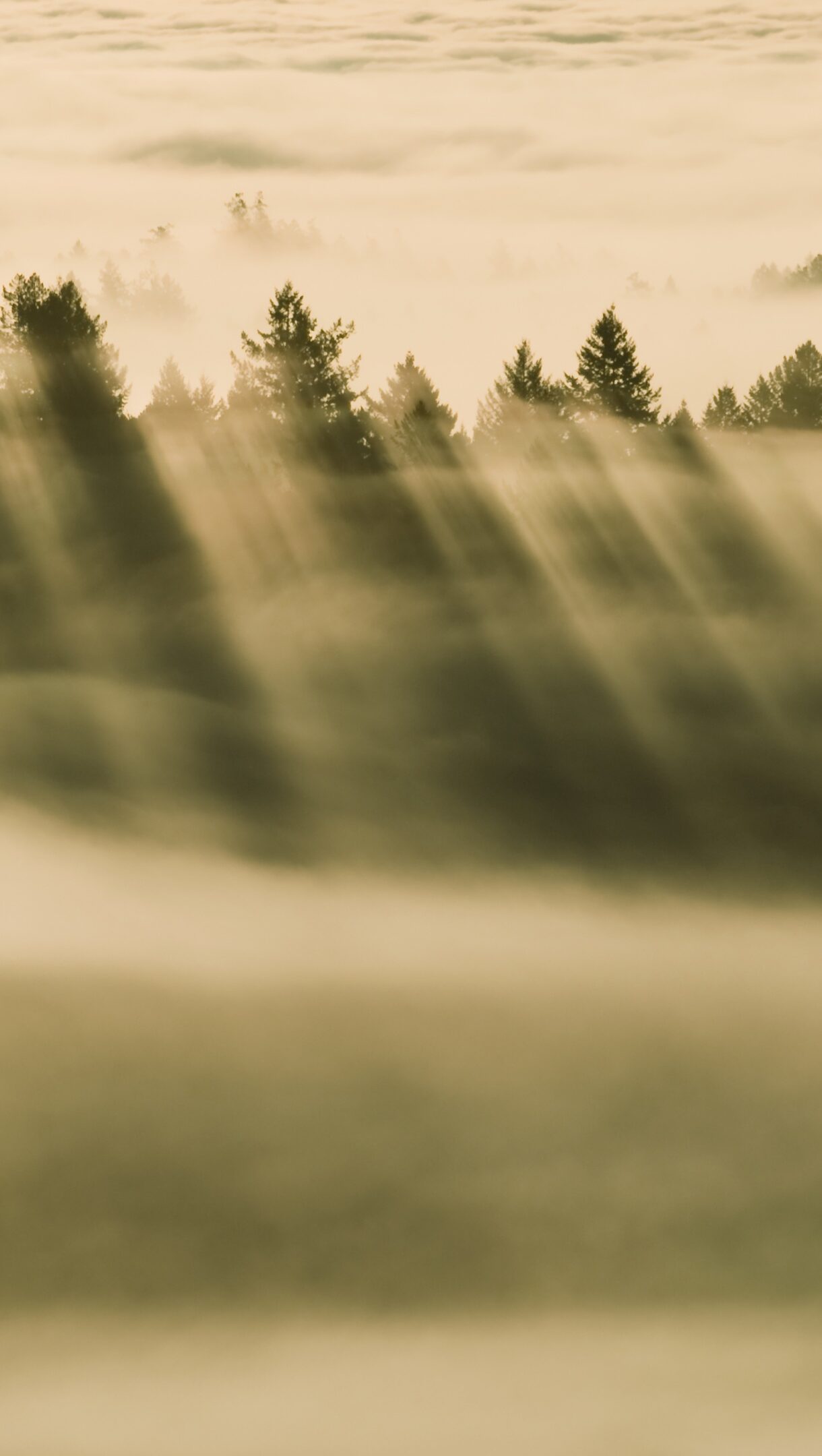 A captivating 4K wallpaper, featuring the iconic OS X Mavericks foggy forest, reveals dark evergreen peaks rising through a thick, golden mist. Dramatic shafts of warm sunlight pierce through the dense haze, casting long, luminous rays that define the scene's ethereal and tranquil mood.