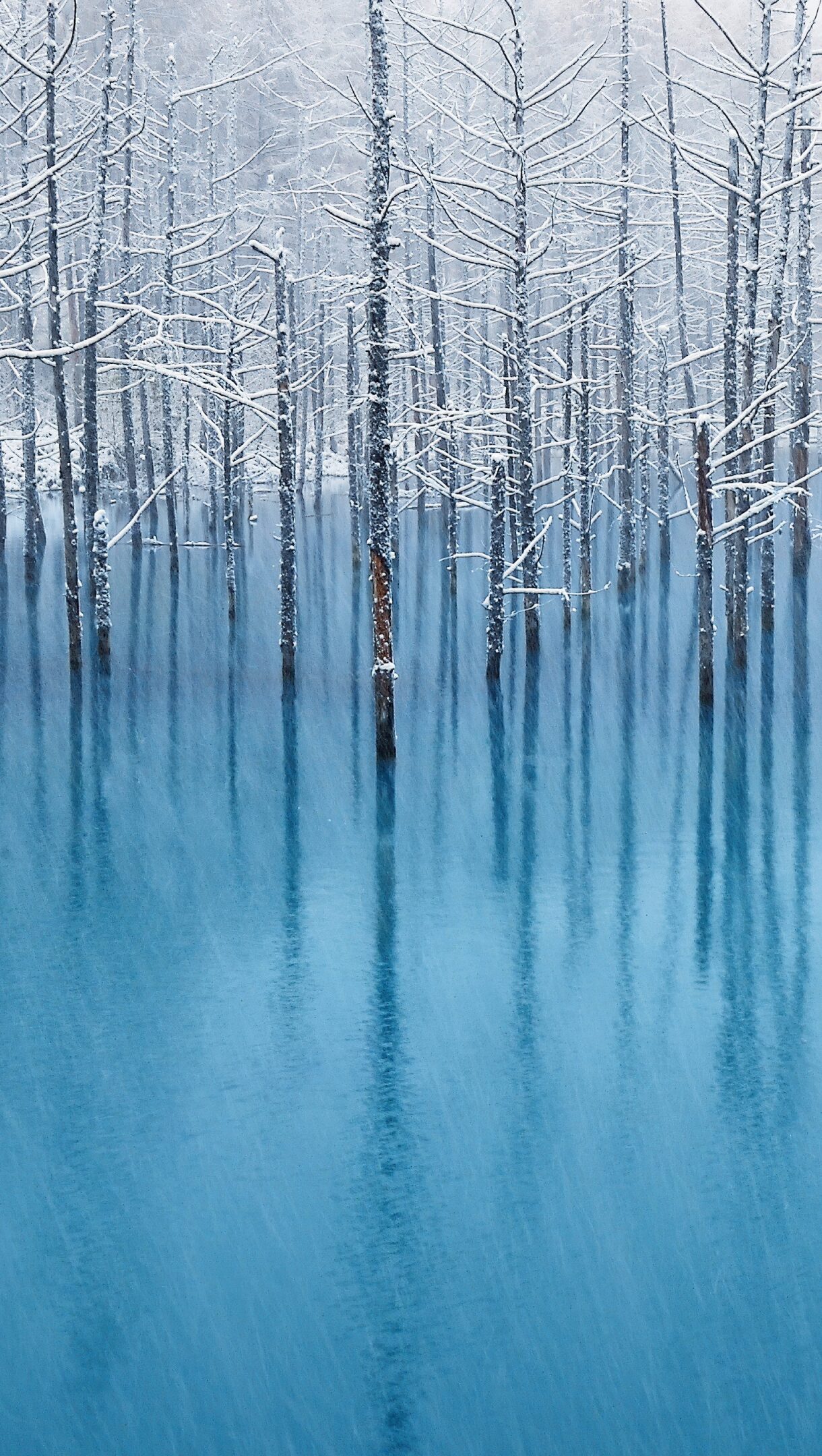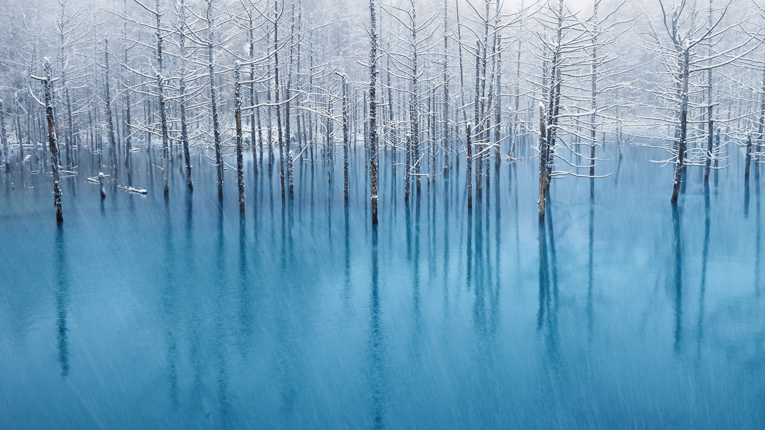 A captivating 4K wallpaper depicts the iconic OS X Mountain Lion Winter Blue Pond, where snow-covered bare trees rise stoically from the strikingly vivid blue water. The delicate dusting of white snow on the branches sharply contrasts with the deep, reflective turquoise of the pond, evoking a profound sense of wintry tranquility.