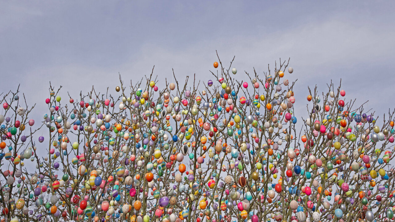 A vibrant 4K wallpaper showcasing the famous Ostereierbaum (Easter Egg Tree) in Saalfeld, Germany, where bare tree branches are densely covered with an abundance of Easter eggs. Hundreds of meticulously decorated eggs in diverse colors and patterns create a dazzling, joyful spectacle against a light, overcast sky.