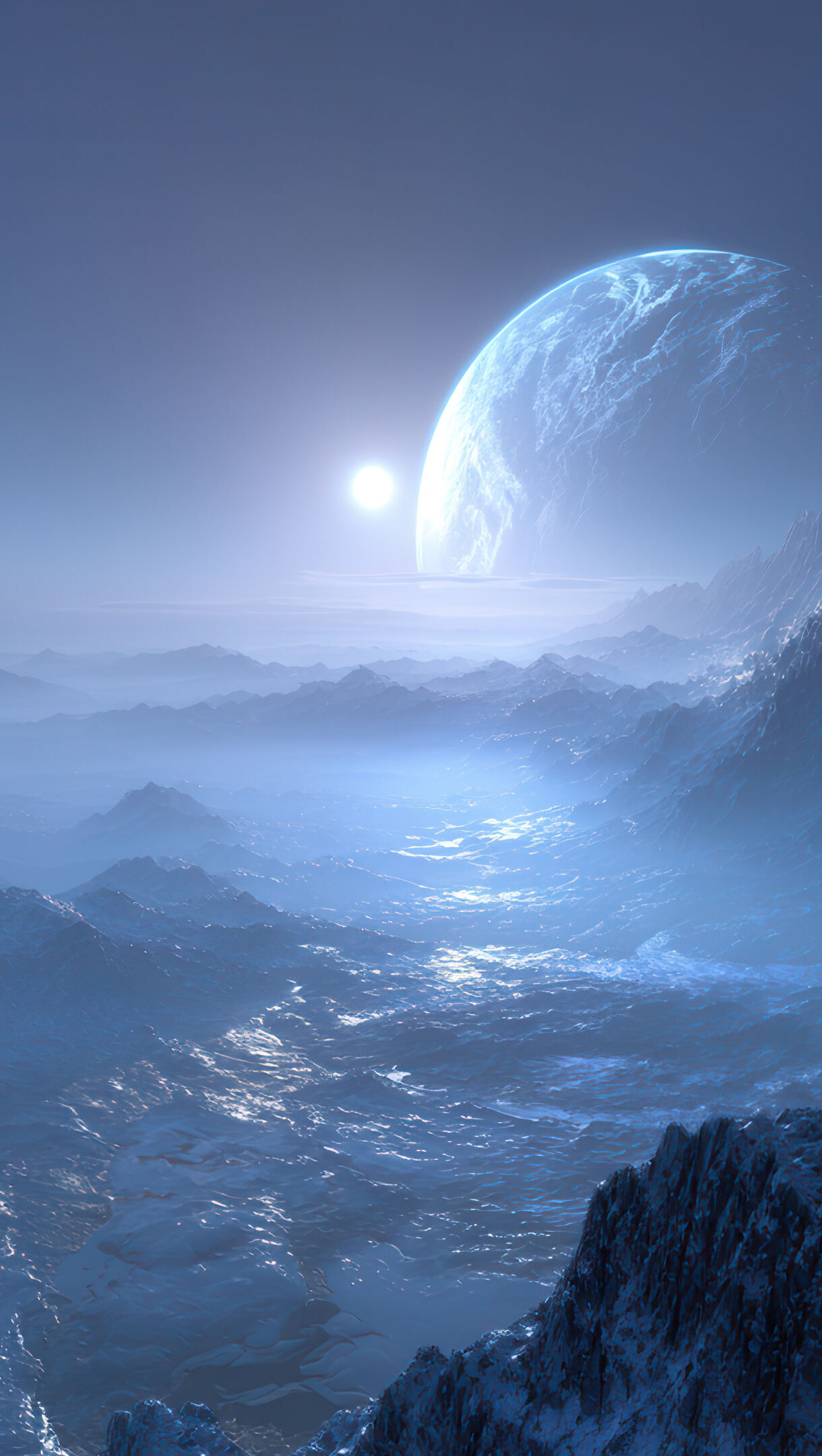 Otherworldly frozen planet with a looming blue giant