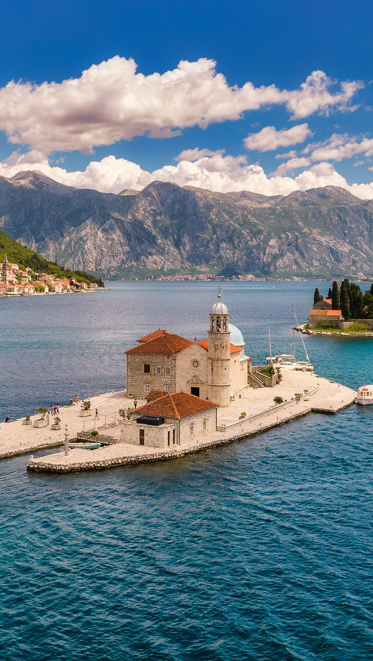 A breathtaking 4K wallpaper capturing the historic Our Lady of the Rocks and Saint George Island nestled within Montenegro's beautiful Bay of Kotor, with the charming town of Perast lining the left shore. The serene turquoise waters of the bay reflect the towering green mountains and a dramatic blue sky, creating a vibrant scene of natural beauty and cultural heritage.