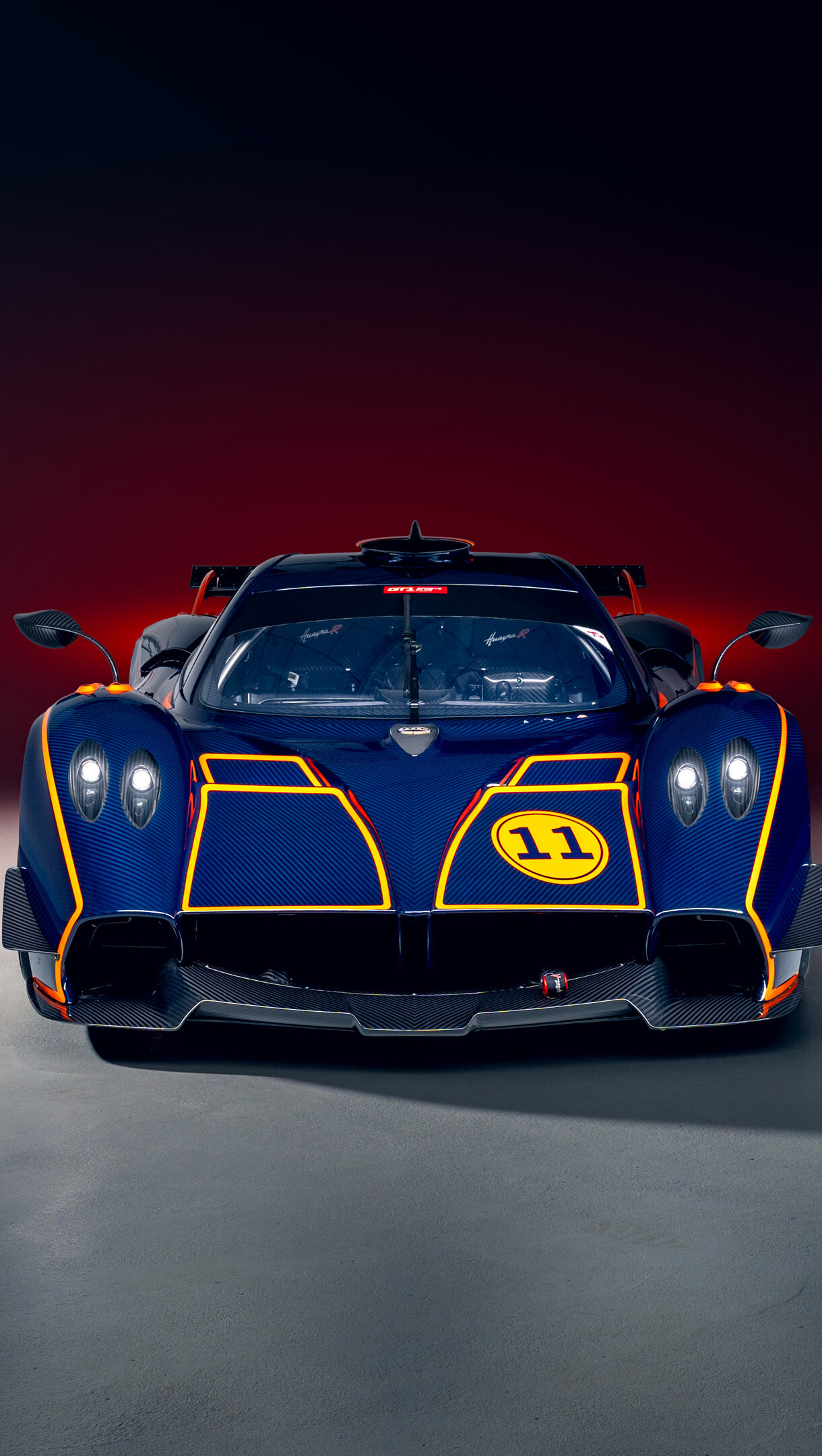 An exhilarating 4K wallpaper showcasing the iconic Pagani Huayra R supercar in a bold blue front view, positioned centrally within a dimly lit studio. Its intricate carbon fiber body, accented with vibrant yellow racing stripes and glowing headlights, creates a striking contrast against the dark, subtly red-tinged background and grey floor.