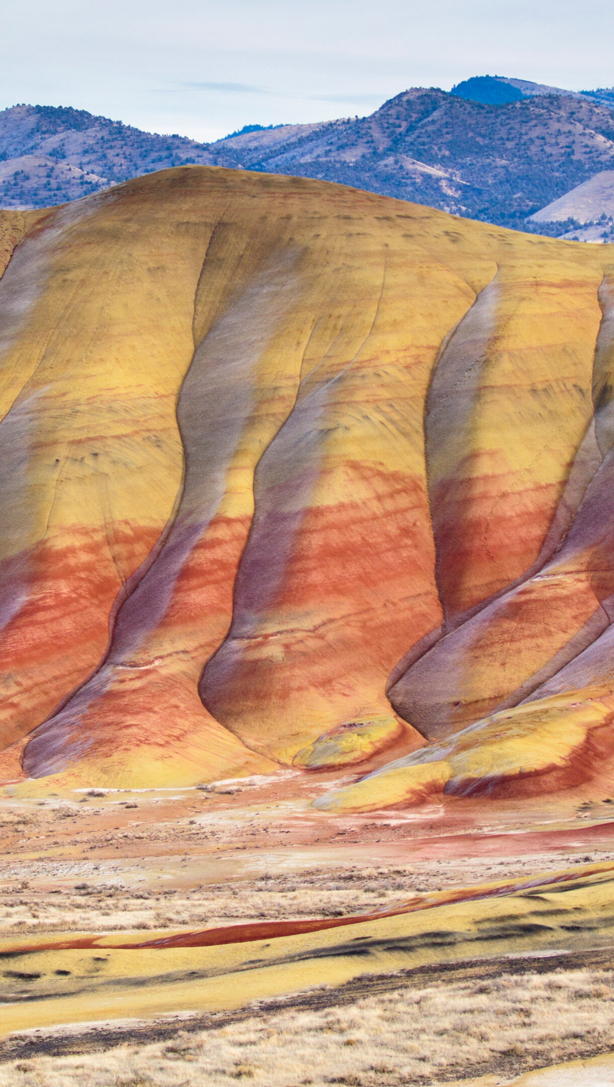 A breathtaking 4K wallpaper showcasing the iconic Painted Hills of John Day Fossil Beds National Monument in Oregon, stretching across a vast, ancient landscape. Layers of vibrant ochre, fiery red, and subtle purple soils dramatically ripple across the undulating terrain, creating an otherworldly tapestry under the pale sky.