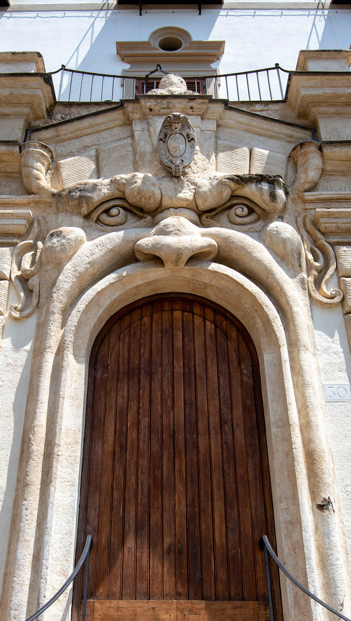 A captivating 4K wallpaper showcasing the iconic grotesque entrance of Palazzo Zuccari in Rome, Italy. The monumental carved stone face, with its wide eyes and gaping mouth forming the main portal, creates a powerful, almost watchful mood under the strong Roman sun, with deep shadows enhancing its ancient, whimsical details.