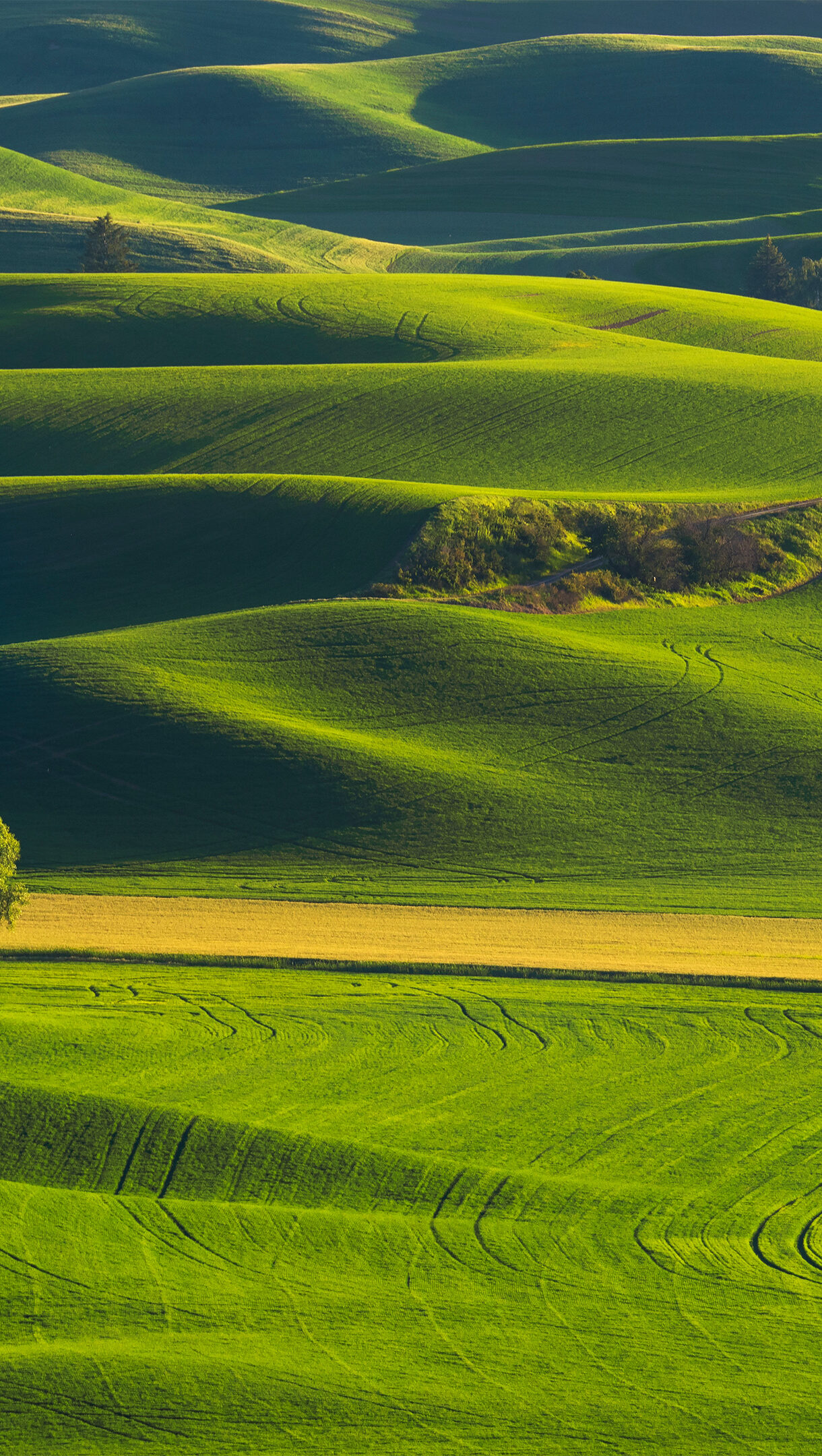 An expansive 4K wallpaper capturing the Palouse region's iconic rolling green farmland hills in Washington State. Golden light beautifully highlights the smooth, contoured fields, casting long, dark shadows that emphasize their dramatic, undulating forms.