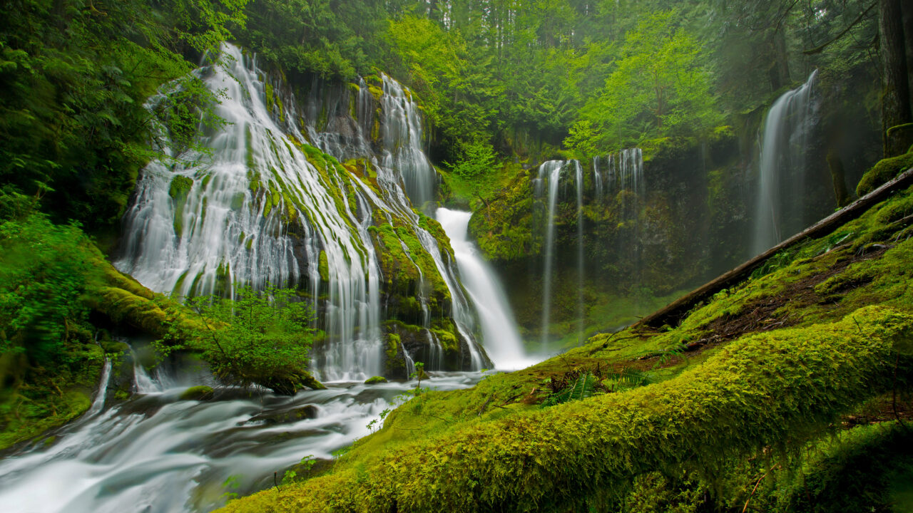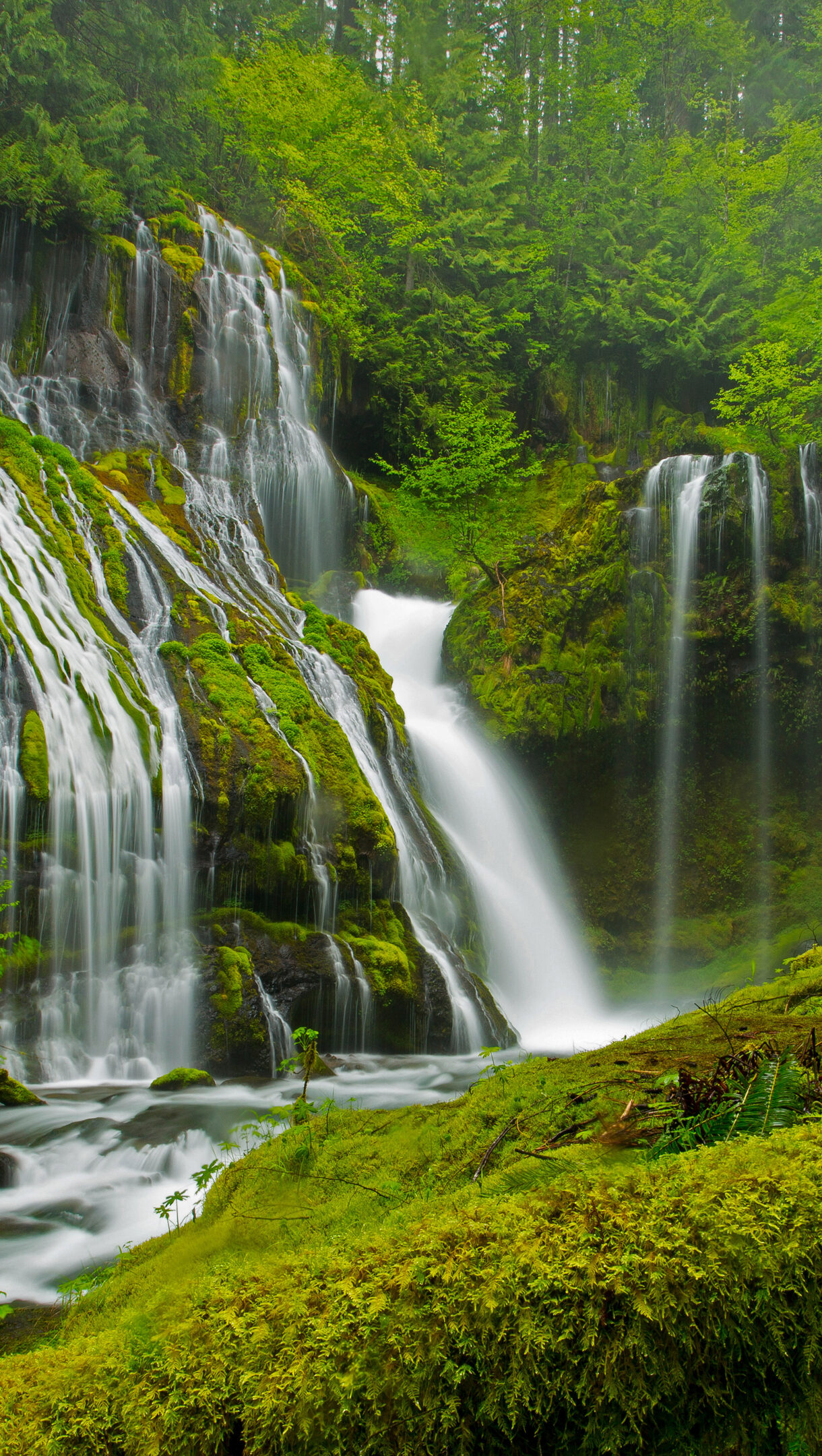 A breathtaking 4K wallpaper capturing Panther Creek Falls in its vibrant spring glory within the Gifford Pinchot National Forest. The long-exposure waterfall creates ethereal white ribbons against a backdrop of intensely green moss, ferns, and towering trees, evoking a fresh and serene woodland atmosphere.