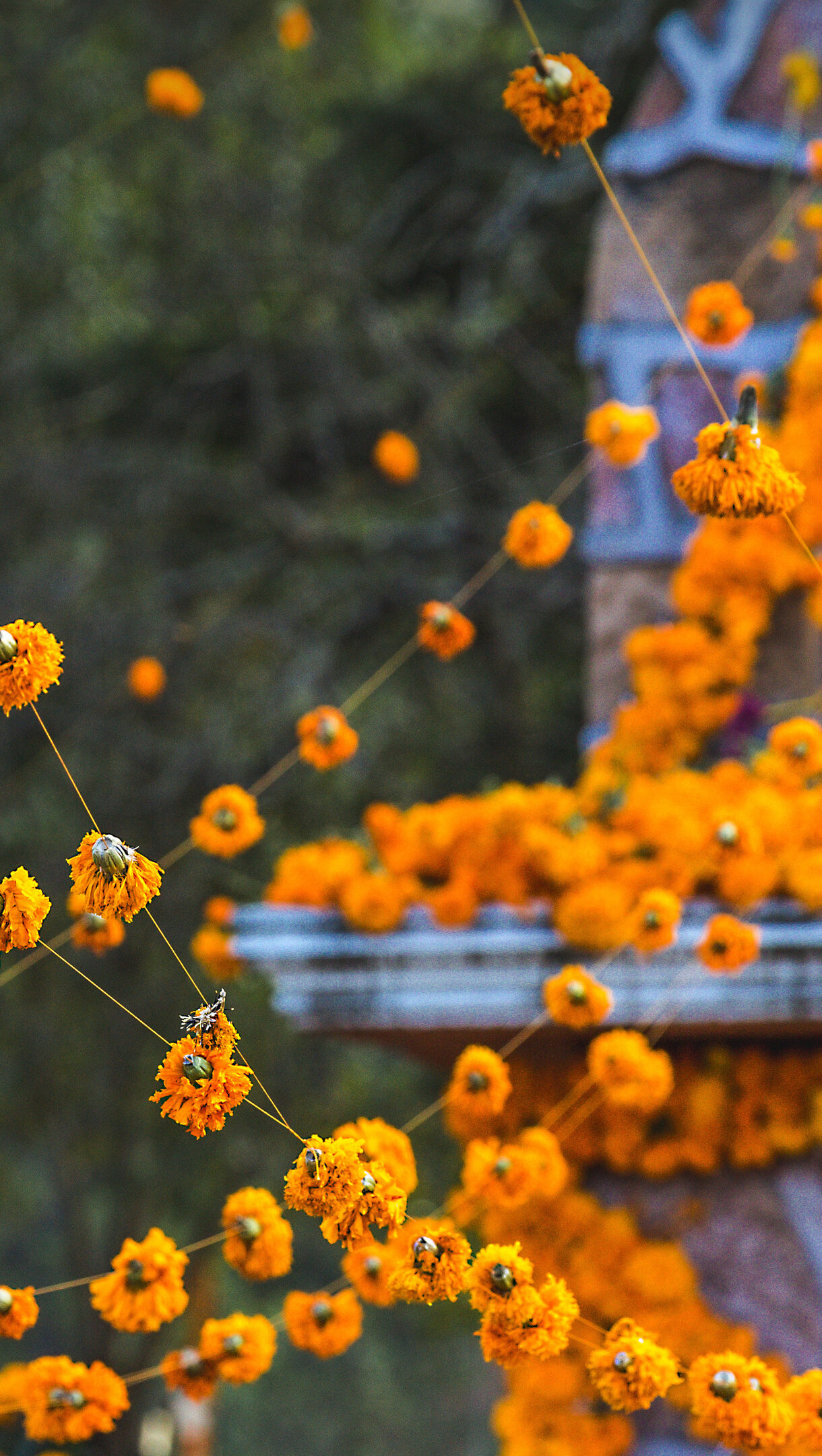 An enchanting 4K wallpaper captures delicate strings of vibrant orange marigold garlands decorating the solemn grounds of Patzcuaro Cemetery. Hundreds of fluffy, deep orange blossoms are suspended on subtle threads, creating a lively yet respectful atmosphere against the blurred green foliage and stone structures.