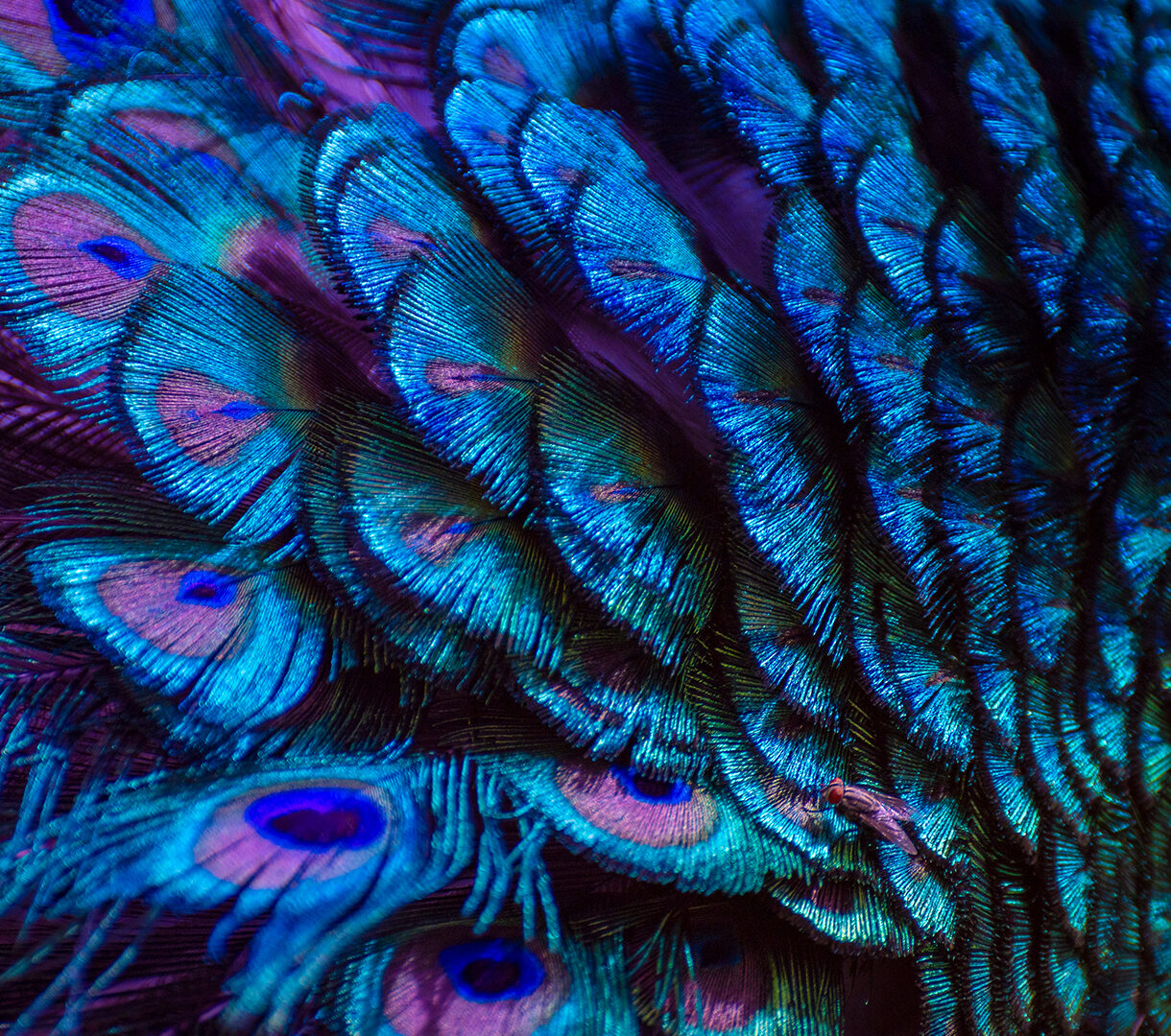 A captivating 4K wallpaper showcasing a dense arrangement of blue and purple peacock feathers. Their intricate texture and vibrant iridescence create a shimmering spectrum of sapphire blues and amethyst purples, shifting with light.