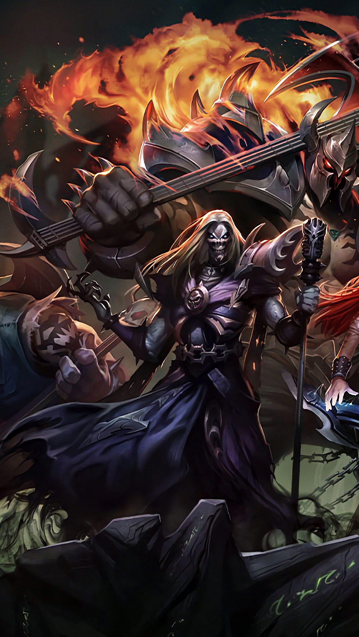 A captivating 4K wallpaper featuring the Pentakill Mordekaiser skin from League of Legends. Mordekaiser, the fearsome master of metal, is depicted in his new skin with epic splendor and musical energy. Experience the excitement and thrill of League Of Legends on your screen. Simply click the download button to bring this masterpiece to life on your screen as a desktop wallpaper or save it for later in your picture collection.