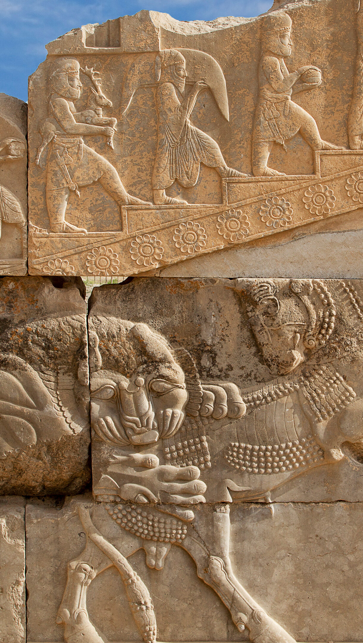 A majestic 4K wallpaper revealing ancient Persian stone reliefs at Persepolis, Iran, under a bright blue sky. Intricate carvings depict mythological struggles like a lion attacking a bull and figures ascending stairs with offerings, alongside ancient cuneiform script, all bathed in warm light that accentuates their weathered texture and historical depth.