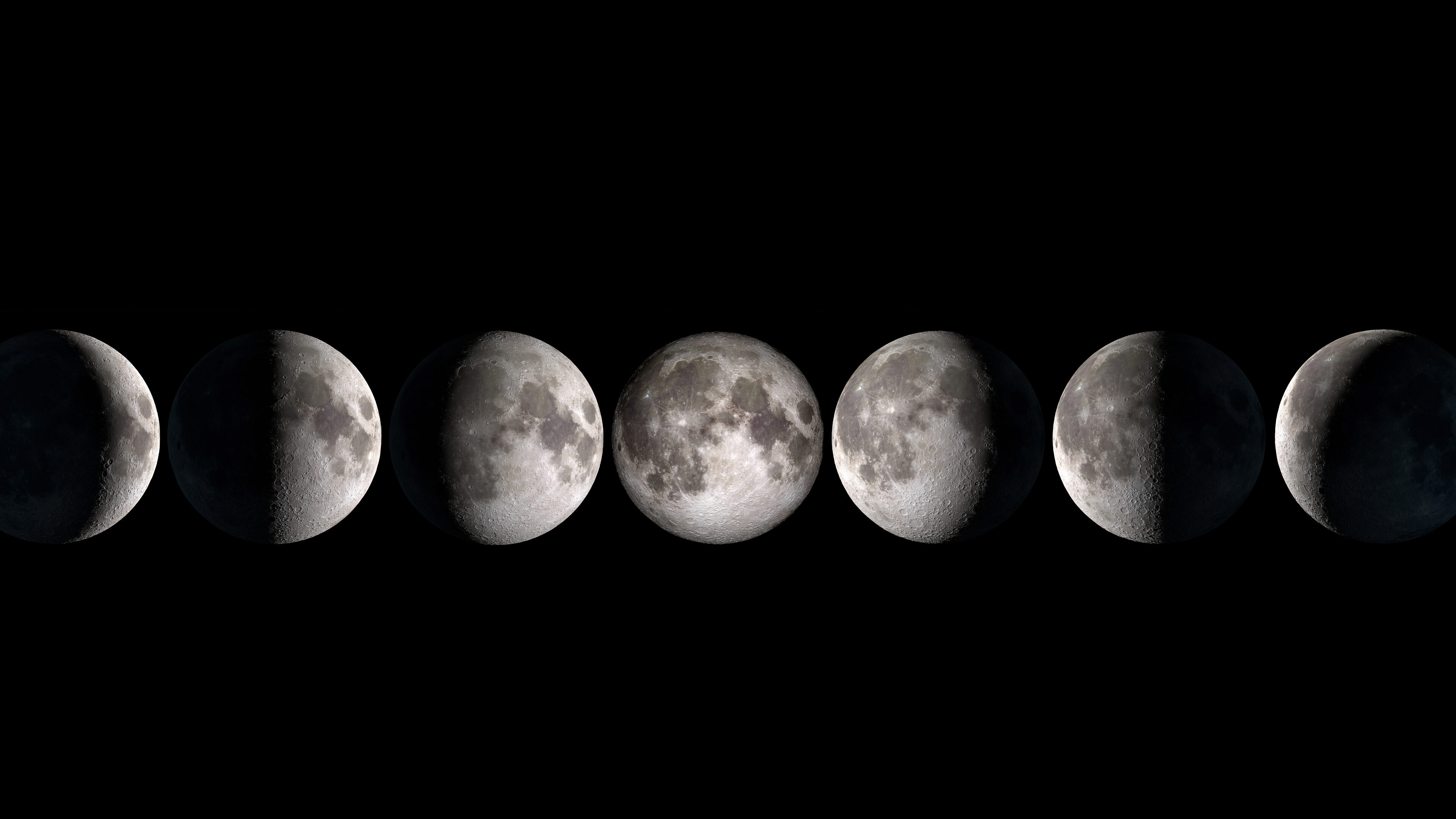 An astronomical 4K wallpaper presents a stunning composite of the Moon's complete cycle of phases, arrayed horizontally against the profound blackness of space. The dramatic interplay of light and shadow across the detailed lunar surface vividly showcases the gradual transformation, creating an awe-inspiring celestial journey.