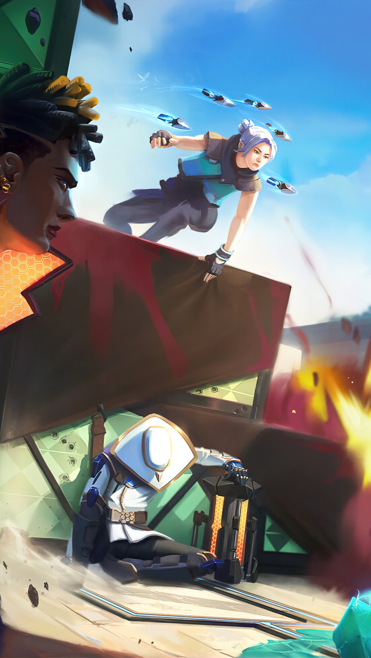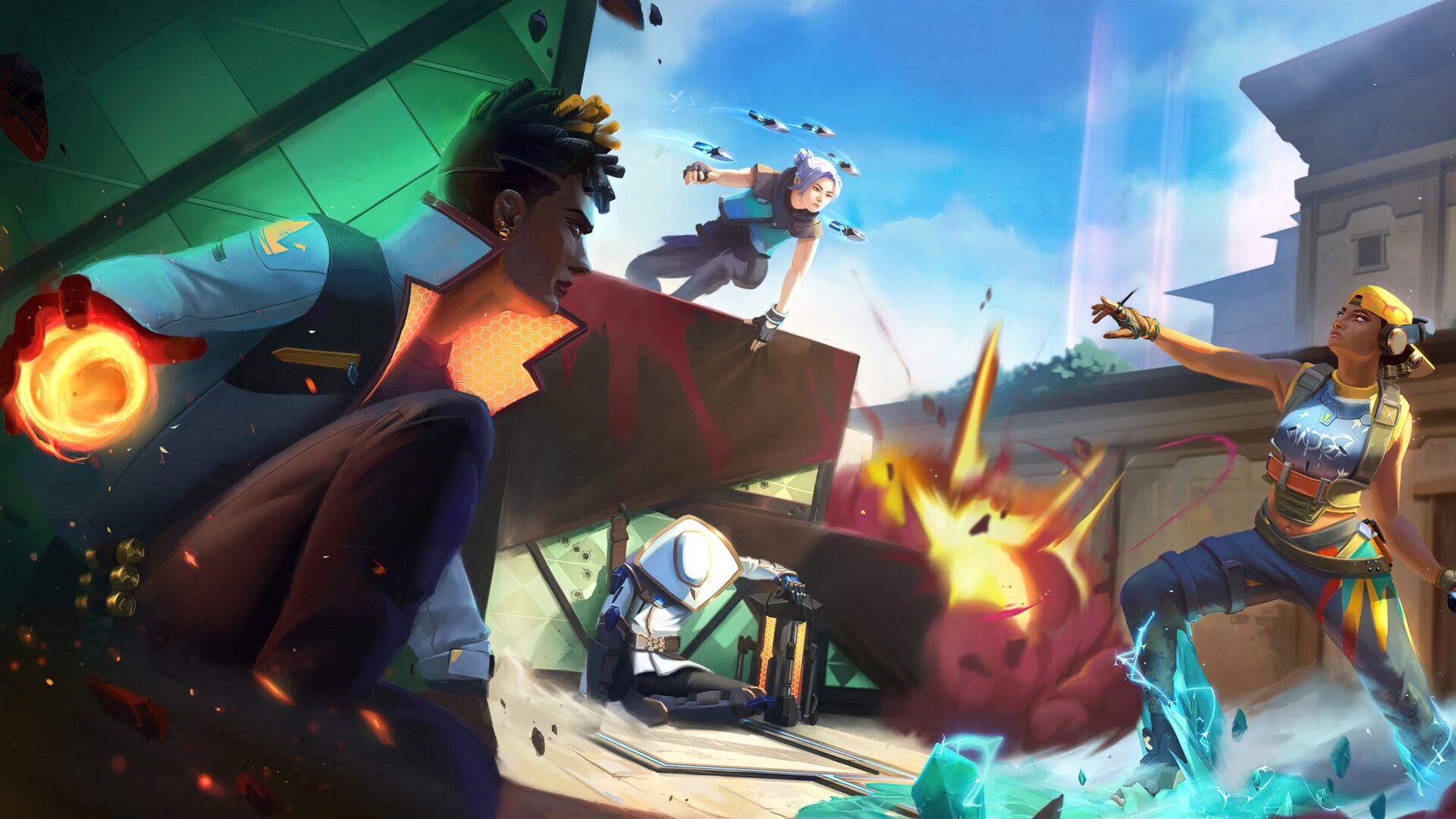 A striking 4K wallpaper showcasing the dynamic characters Phoenix, Raze, Jett, and Cypher from the popular game Valorant. This high-resolution wallpaper captures the essence of the intense battles in the game. Simply click the download button to bring this masterpiece to life on your screen as a desktop wallpaper or save it for later in your picture collection.