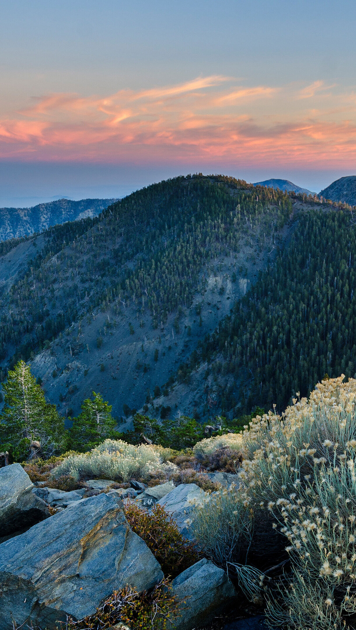 A breathtaking 4K wallpaper capturing a sweeping vista from Pine Mountain Summit, looking out over multiple layers of pine-covered ridges and distant valleys. The setting sun paints the sky with soft hues of pink and orange, casting a warm glow on the foreground rocks and silvery shrubs, creating an expansive and serene atmosphere.