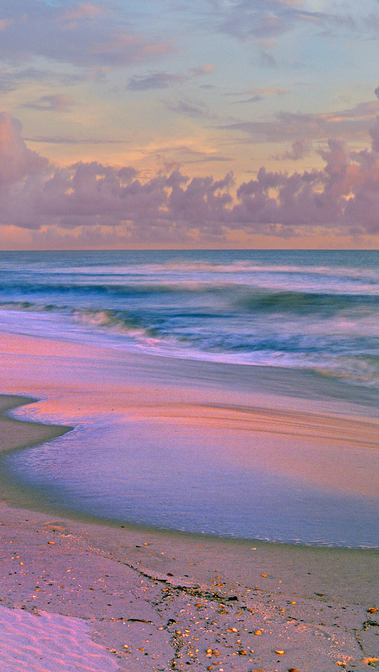 A serene 4K wallpaper showcases the ethereal pink sands of a Florida Gulf Islands beach at dawn. The soft, diffused dawn light bathes the entire scene in hues of rose and lavender, creating a tranquil, dreamlike atmosphere.