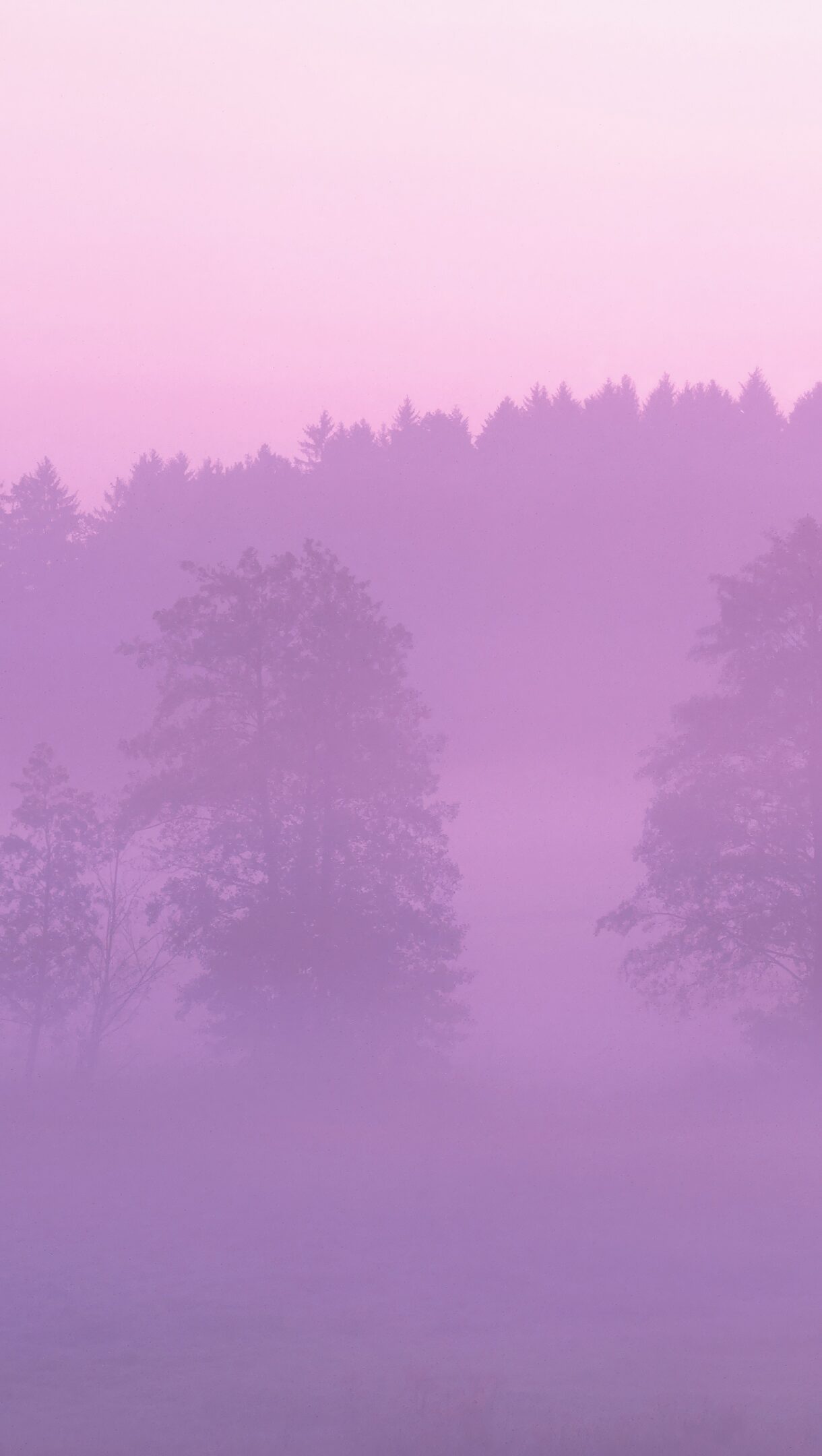A mystical 4K wallpaper captures a silent pink misty forest, evoking the calm and sophisticated style often seen in OS X environments. The soft, luminous fog obscures the distant trees, emphasizing the gentle blend of lavender and rose hues that saturate the entire scene.