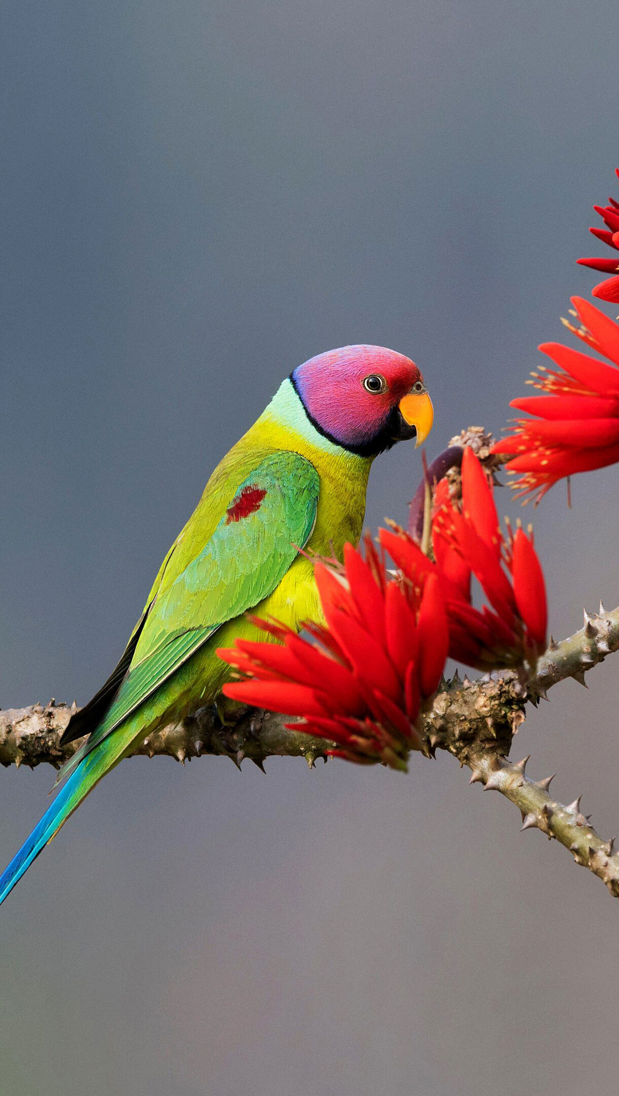 Plum-headed Parakeet On Branch With Red Flowers Shimoga Wallpaper