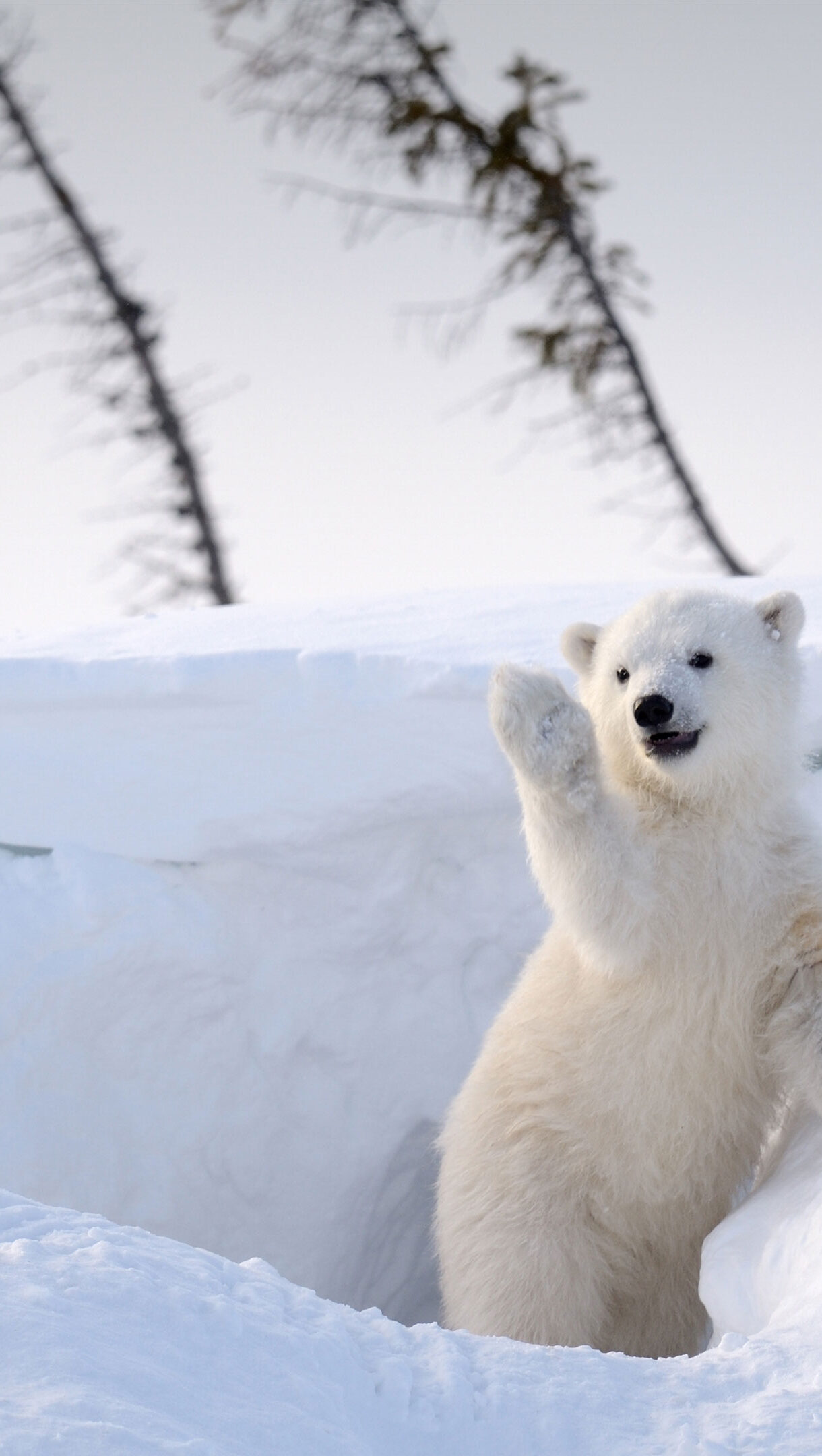 A charming 4K wallpaper depicts a playful Polar Bear cub emerging from a snowy den in Churchill, Canada. With a paw raised in an adorable wave, the cub's bright white fur stands out against the soft blue-white snow and distant dark evergreens, creating a heartwarming winter scene.