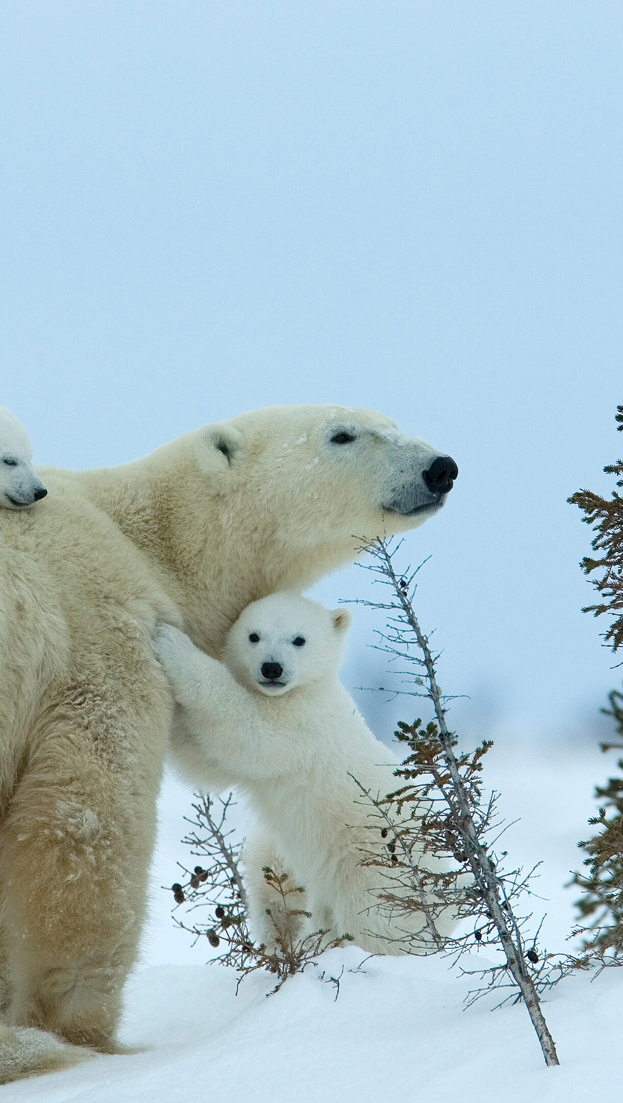 A captivating 4K wallpaper captures a polar bear mother and her two adorable cubs traversing the snowy expanse of Churchill, Manitoba, against a soft, pale blue sky and scattered pine trees. One cub naps snugly on the mother's back, while the other stands playfully at her side, looking upward, emphasizing the warmth of their bond and the pure white textures of their fur and the surrounding snow.