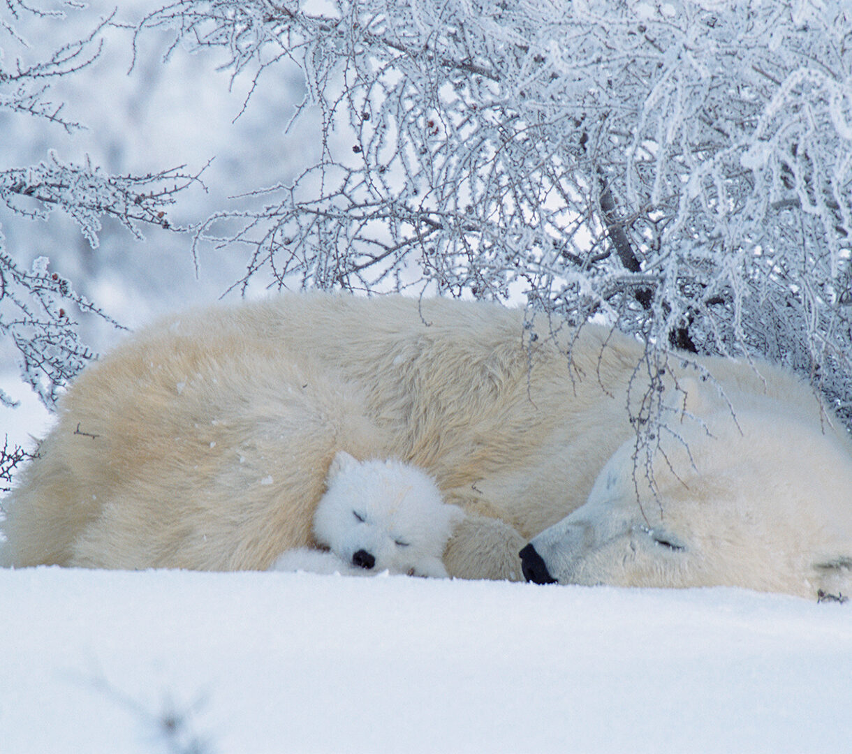 An ethereal 4K wallpaper featuring a polar bear mother and her cub soundly asleep in the vast Canadian winter snowscape. The exquisite white fur of the sleeping bears, nestled amongst the glistening snow and frosty branches, evokes a profound sense of peace and natural beauty.