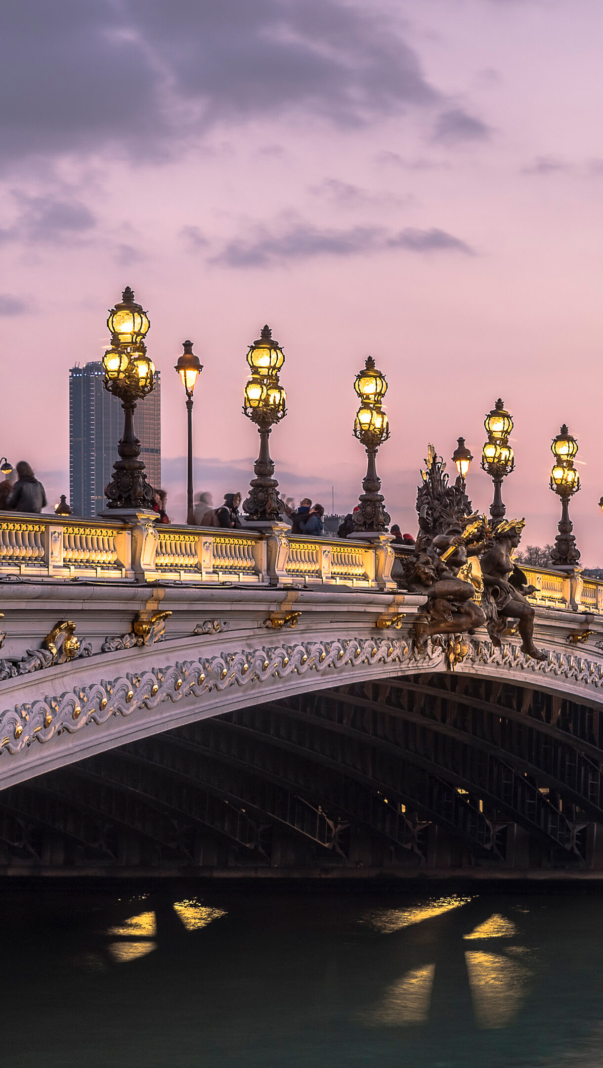 A majestic 4K wallpaper of the ornate Pont Alexandre III Bridge spanning the Seine River in Paris, France, at twilight. Its intricate golden statues and countless glowing lamps cast a warm, inviting glow against the soft pink and lavender twilight sky, reflecting enchantingly on the calm river below.