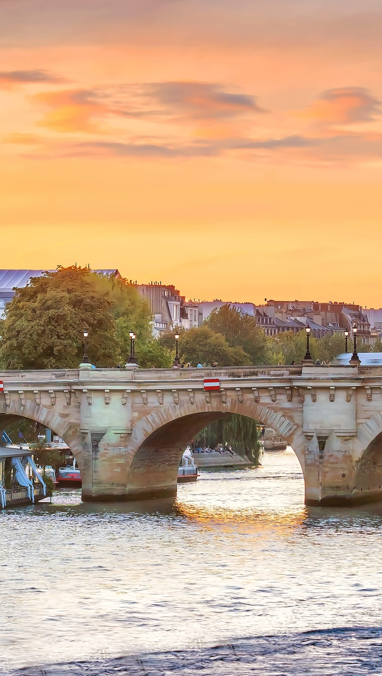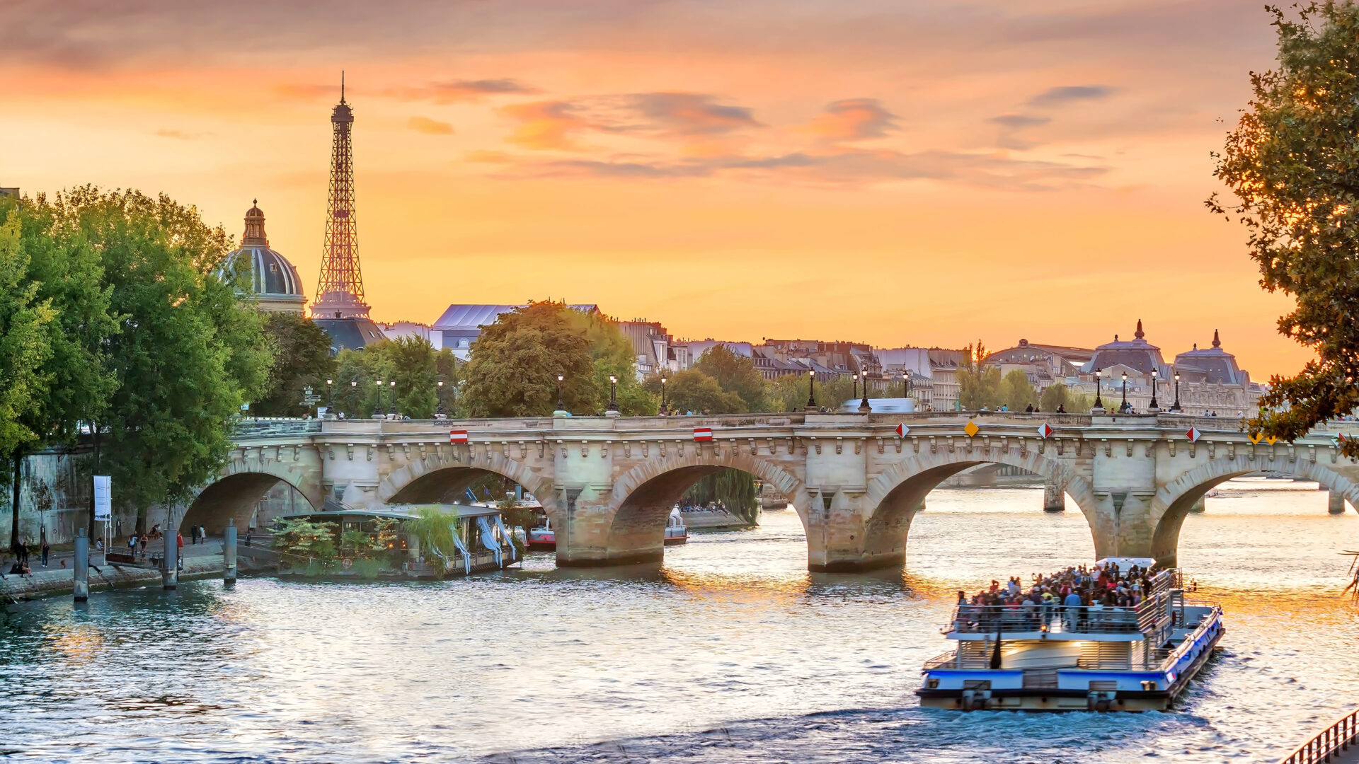 A breathtaking 4K wallpaper showcases the iconic Pont Neuf stretching over the serene Seine River in Paris, with the Eiffel Tower prominent in the background and a tour boat gracefully cruising by. The tranquil scene is bathed in the warm, golden glow of sunset, casting vibrant orange and pink hues across the sky and reflecting gently on the river's surface, creating a magical ambiance.