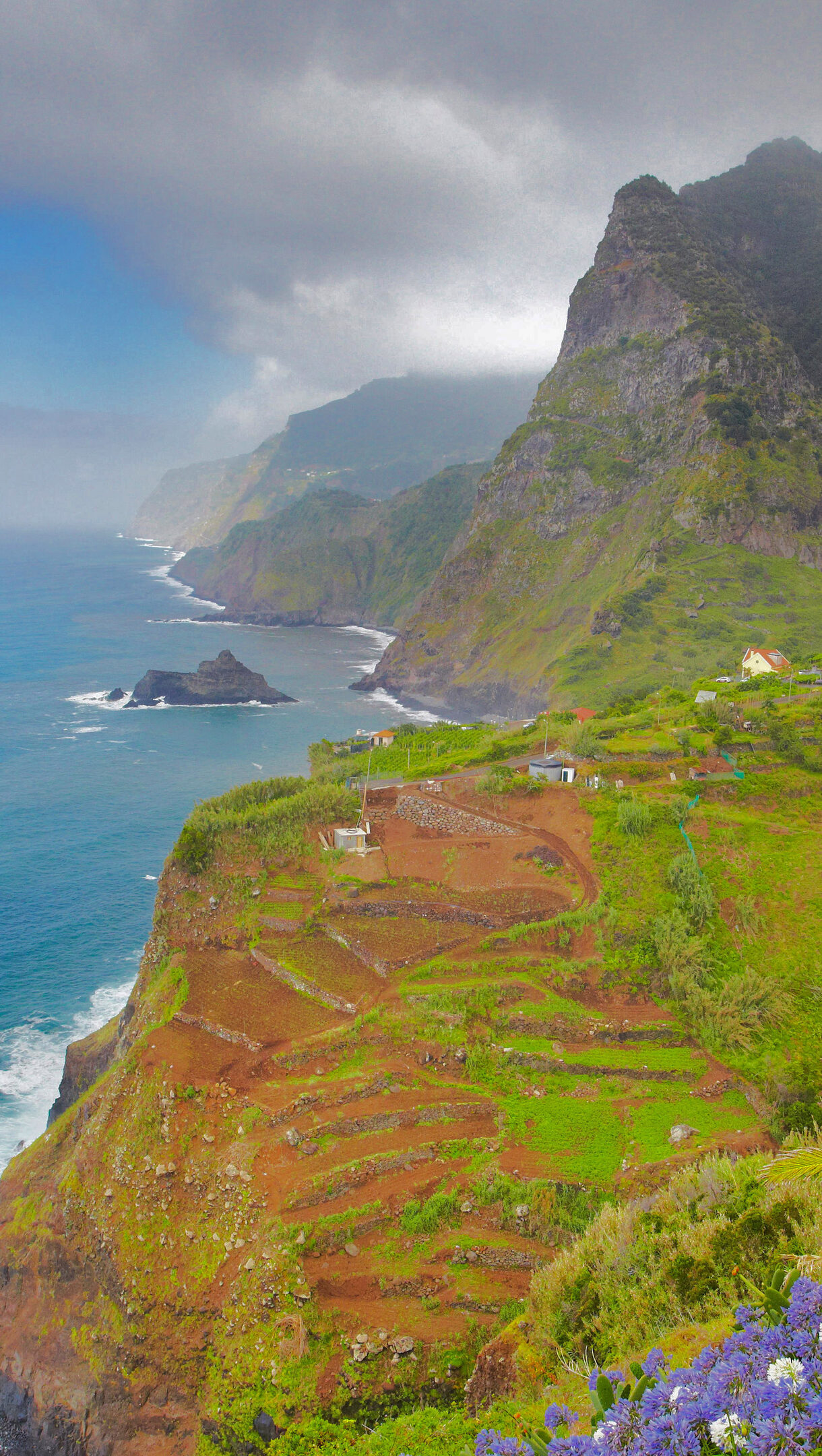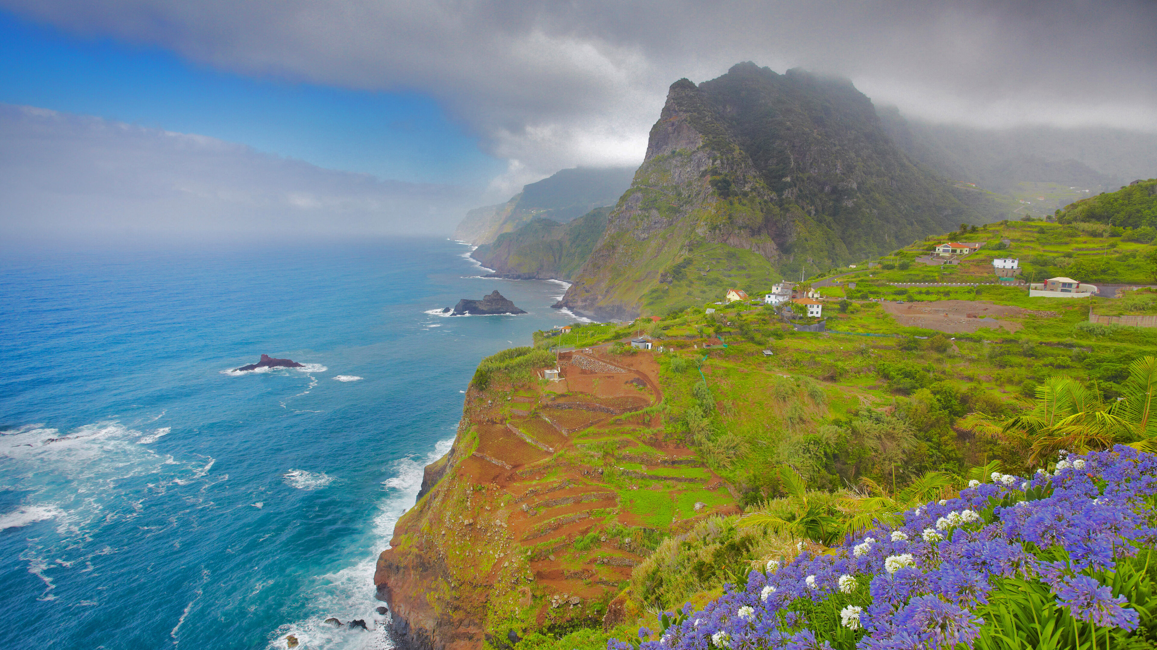 An exquisite 4K wallpaper captures the breathtaking Ponta Delgada Coastline in Madeira, Portugal, where dramatic ocean cliffs meet lush green hills. A vibrant cascade of purple and white Agapanthus flowers in the foreground beautifully contrasts with the deep blue ocean and the rugged, cloud-kissed mountains, conveying a serene yet powerful mood.