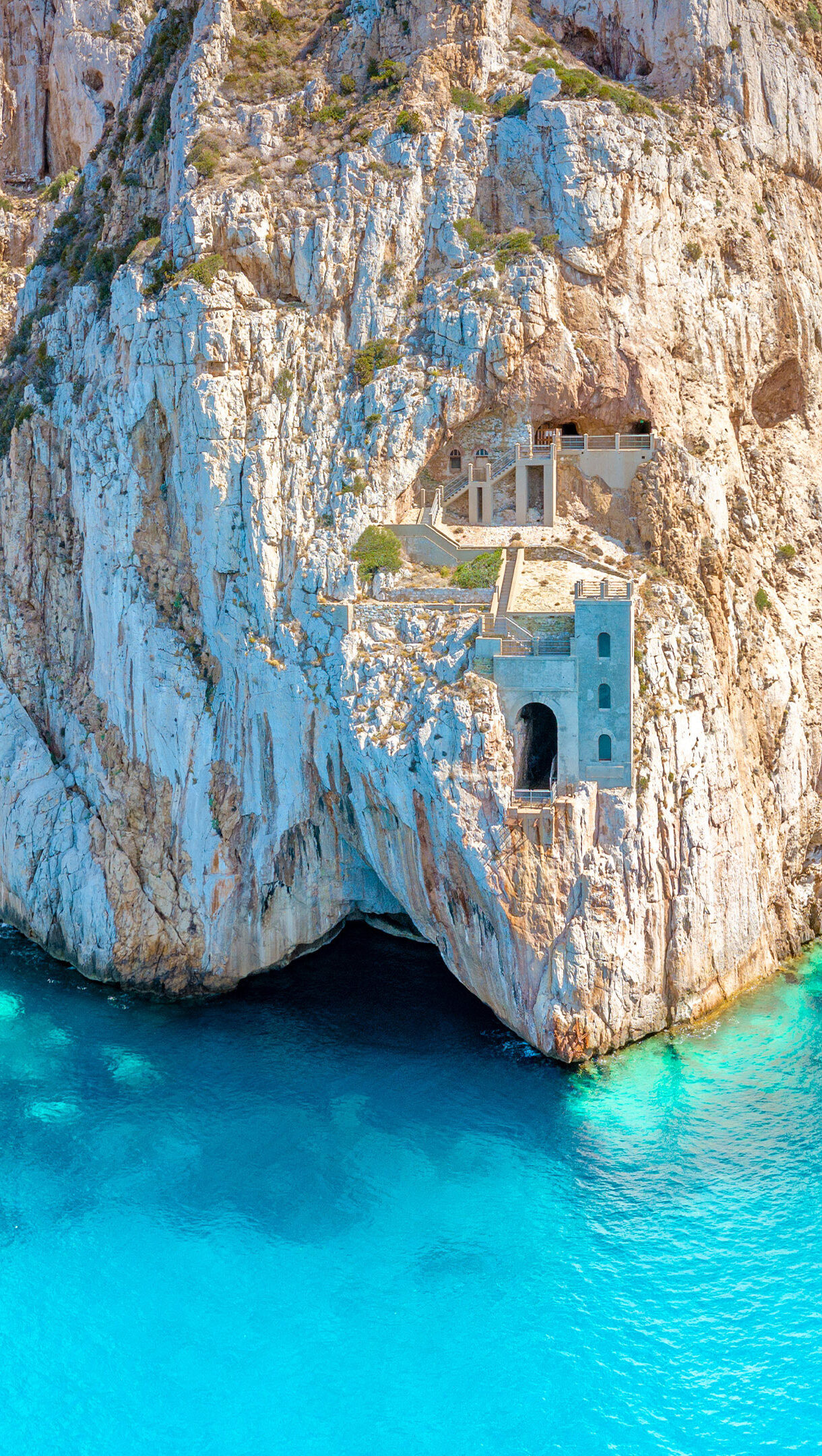 A captivating 4K wallpaper featuring Porto Flavia, a historic mining port built into the rugged coastal cliffs of Sardinia, Italy. The incredibly vibrant turquoise water below contrasts beautifully with the towering golden and white cliffs, defining a breathtaking and serene coastal vista.