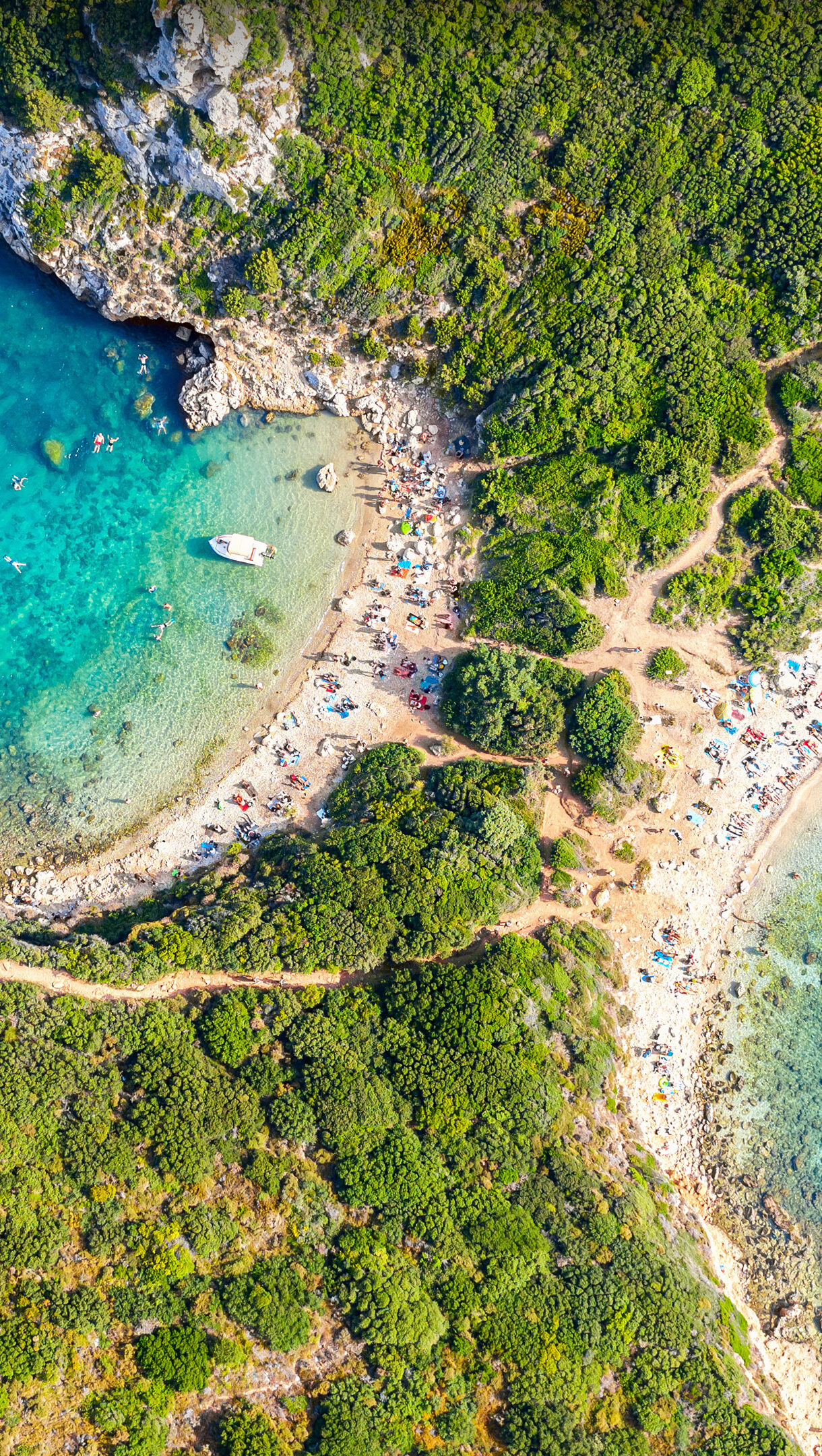 A captivating 4K wallpaper offers an aerial view of Porto Timoni Beach in Corfu, Greece, where two crescent beaches meet to form a striking natural double cove. The brilliantly clear turquoise waters, dotted with swimmers and small boats, are framed by lush green hillsides, creating an inviting and serene tropical escape.