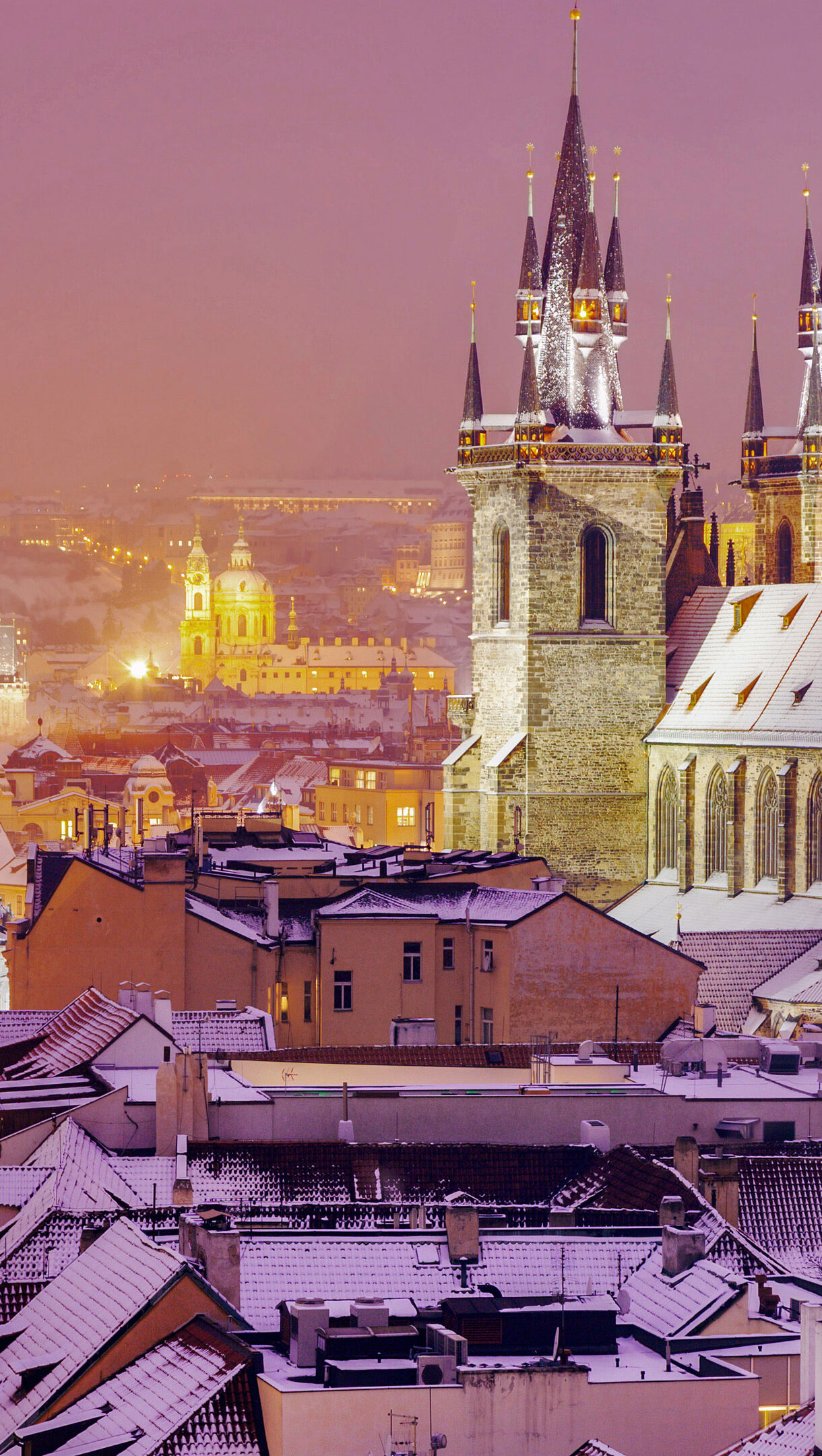 A sublime 4K wallpaper depicting the winter skyline of Prague, Czech Republic, cloaked in a fresh layer of snow. Golden lights illuminate the snow-dusted spires and rooftops, creating a magical glow against the soft, dusky purple sky.