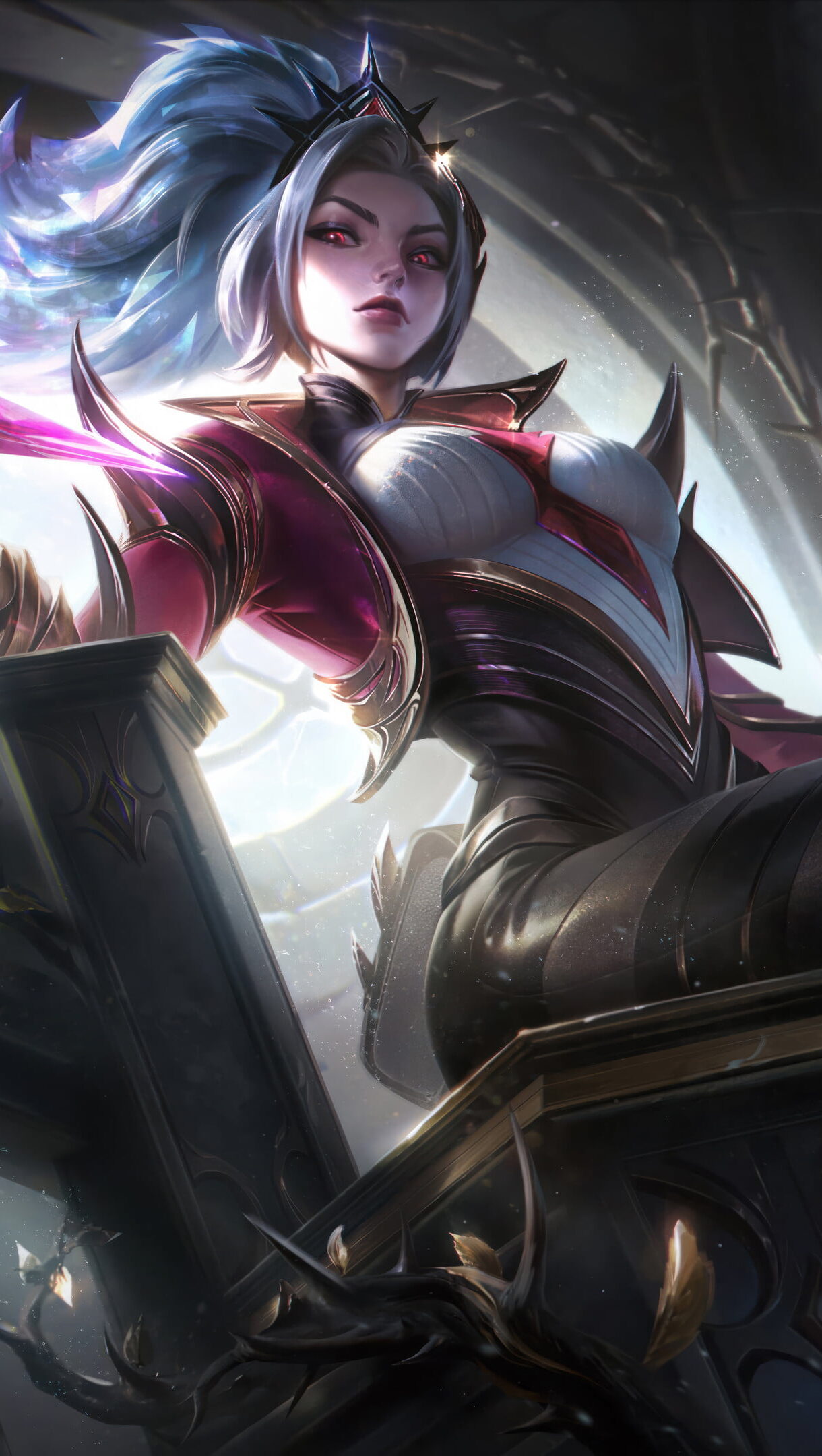 An exquisite 4K wallpaper showcasing the prestigious Prestige Coven Akali skin, featuring Akali, the Rogue Assassin, adorned in opulent regalia within the mystical realm of League of Legends. Simply click the download button to bring this masterpiece to life on your screen as a desktop wallpaper or save it for later in your picture collection.